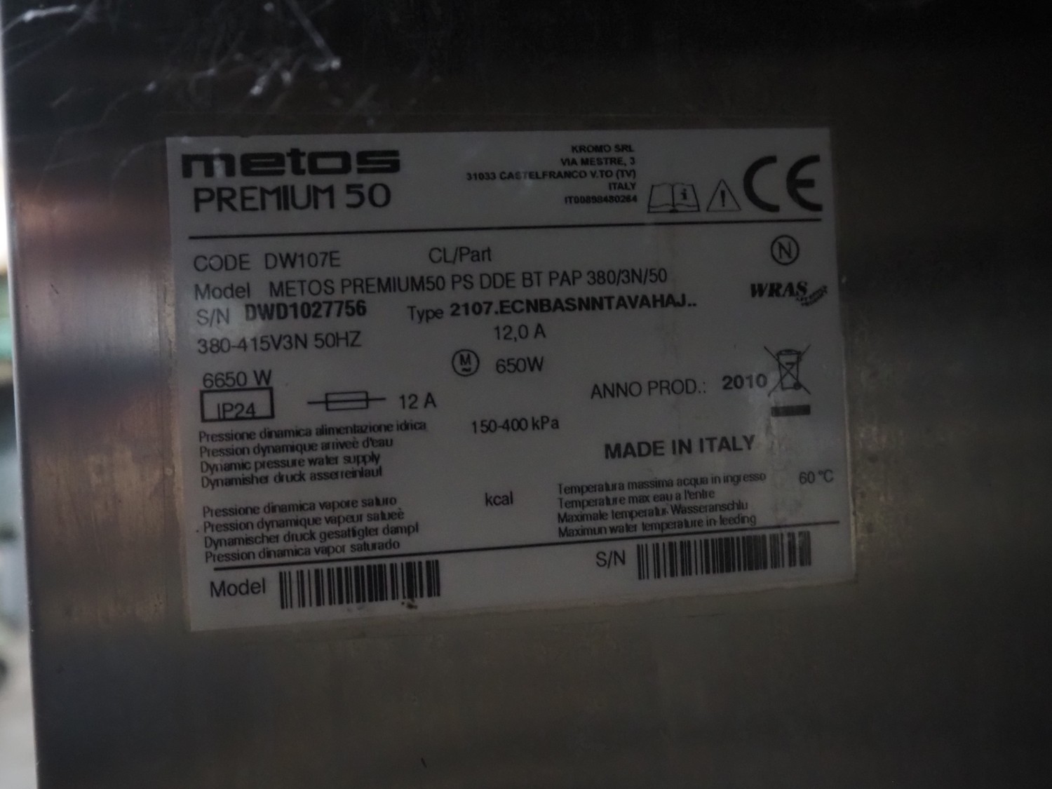 Metos dishwasher, model: METOS PREMIUM50 PS DDE BT PAP, serial number: DWD1027756, year of construction: 2010, 380-415 V, 3 Ph, 50 Hz, 12 A, 6650 W, dimensions: 650 mm x 600 mm x 1370 mm.