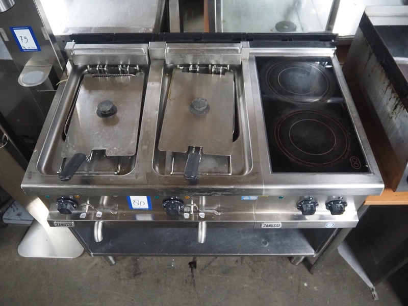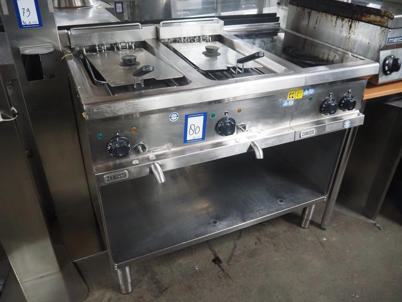 Zanussi double fryer with ceramic hob, dimensions fryer: (2x) 300 mm x 200 mm x 120 mm, dimensions ceramic hob: 550 mm x 300 mm, total dimensions: 1060 mm x 700 mm x 940 mm.