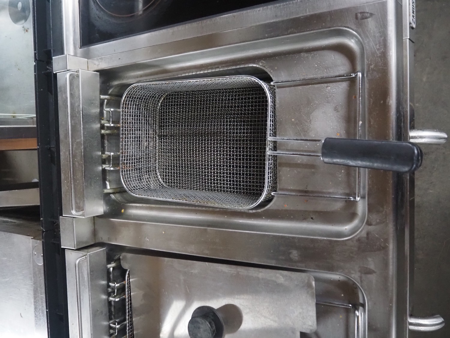 Zanussi double fryer with ceramic hob, dimensions fryer: (2x) 300 mm x 200 mm x 120 mm, dimensions ceramic hob: 550 mm x 300 mm, total dimensions: 1060 mm x 700 mm x 940 mm.
