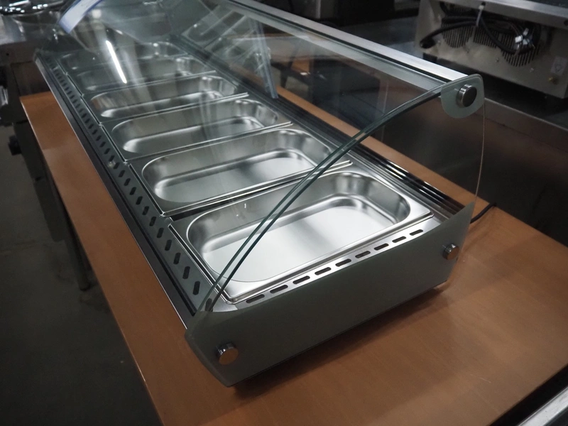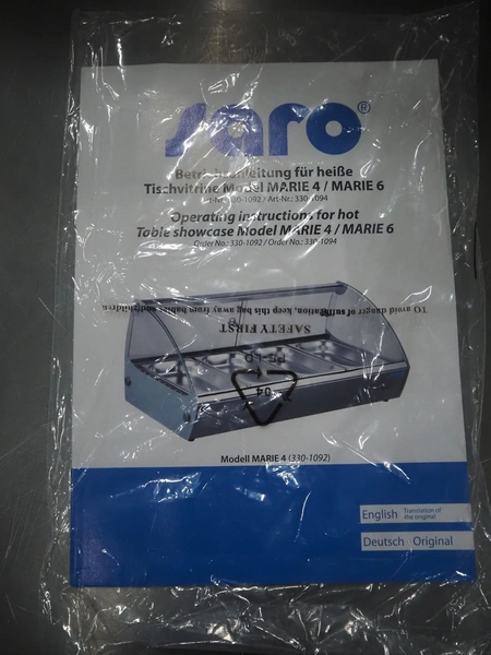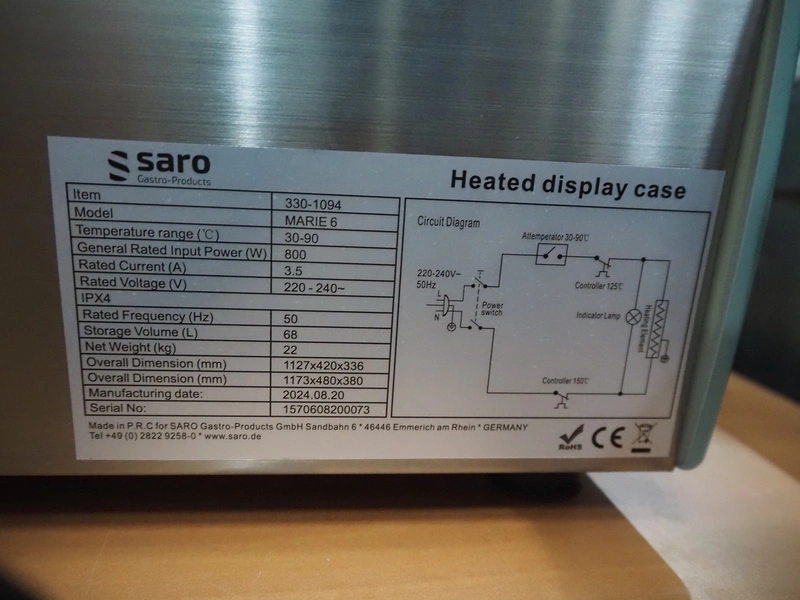 Saro Gastro-Products GmbH heated display case, model: MARIE 6, serial number: 1570608200073, year of construction: 2024.08.20, 220/240 V, 50 Hz, 3.5 A, 800 W, temperature range: 30/90°C, weight: 22, volume: 68 liter, 6 gastronorm bins, bin dimensions: 325 mm x 175 mm x 45 mm, total dimensions: 1120 mm x 420 mm x 340 mm.