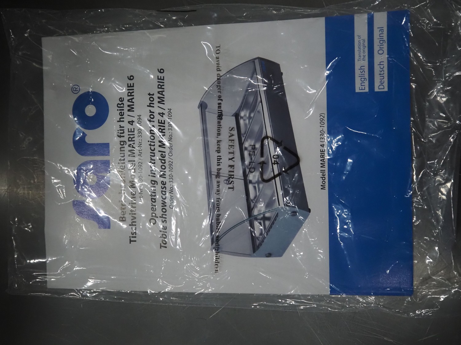 Saro Gastro-Products GmbH heated display case, model: MARIE 6, serial number: 1570608200073, year of construction: 2024.08.20, 220/240 V, 50 Hz, 3.5 A, 800 W, temperature range: 30/90°C, weight: 22, volume: 68 liter, 6 gastronorm bins, bin dimensions: 325 mm x 175 mm x 45 mm, total dimensions: 1120 mm x 420 mm x 340 mm.