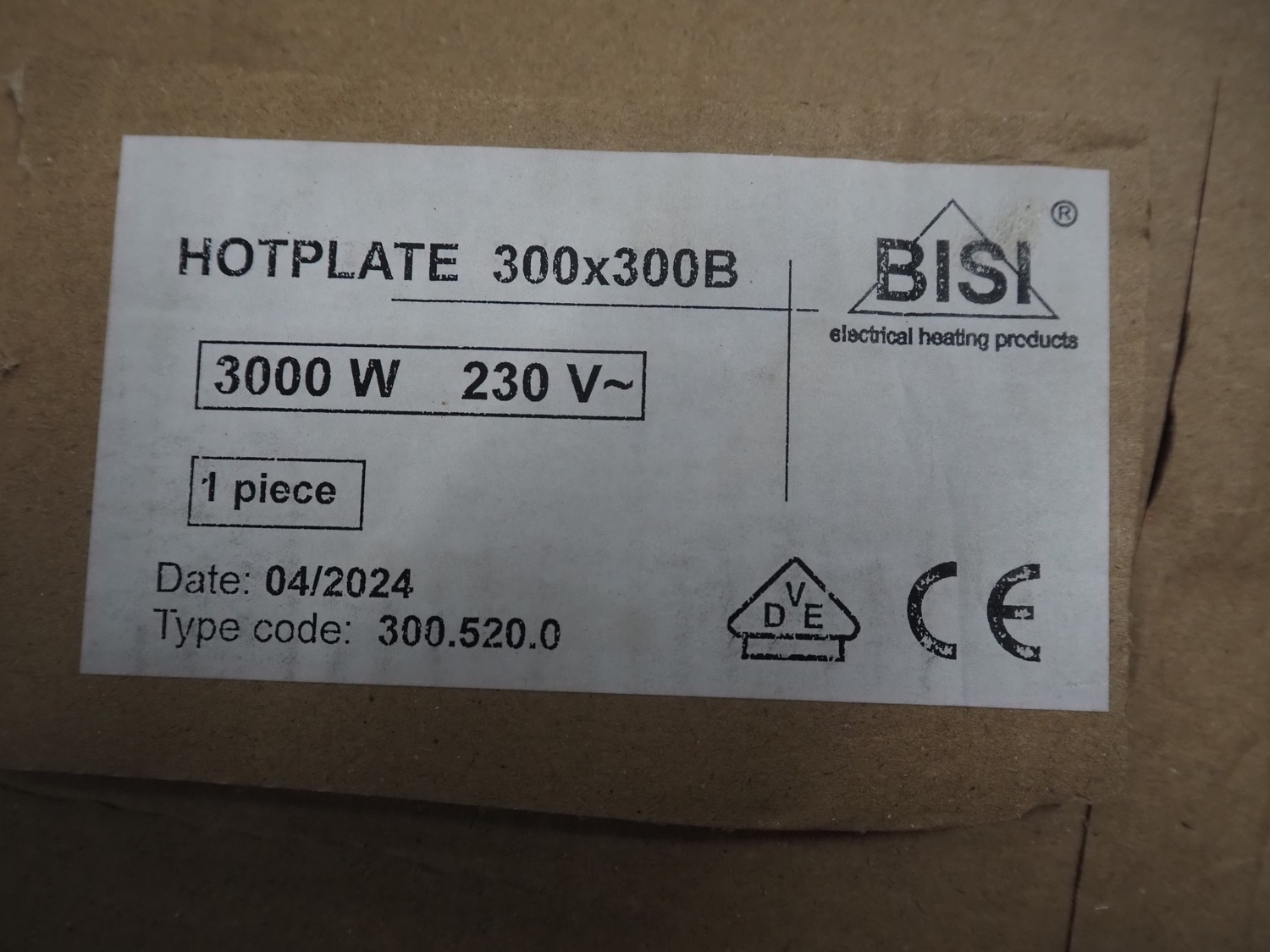 BISI hotplate, type: 300.520.0, year of construction: 04/2024, 230 V, 3000 W, dimensions: 300 mm x 300 mm x 100 mm.
