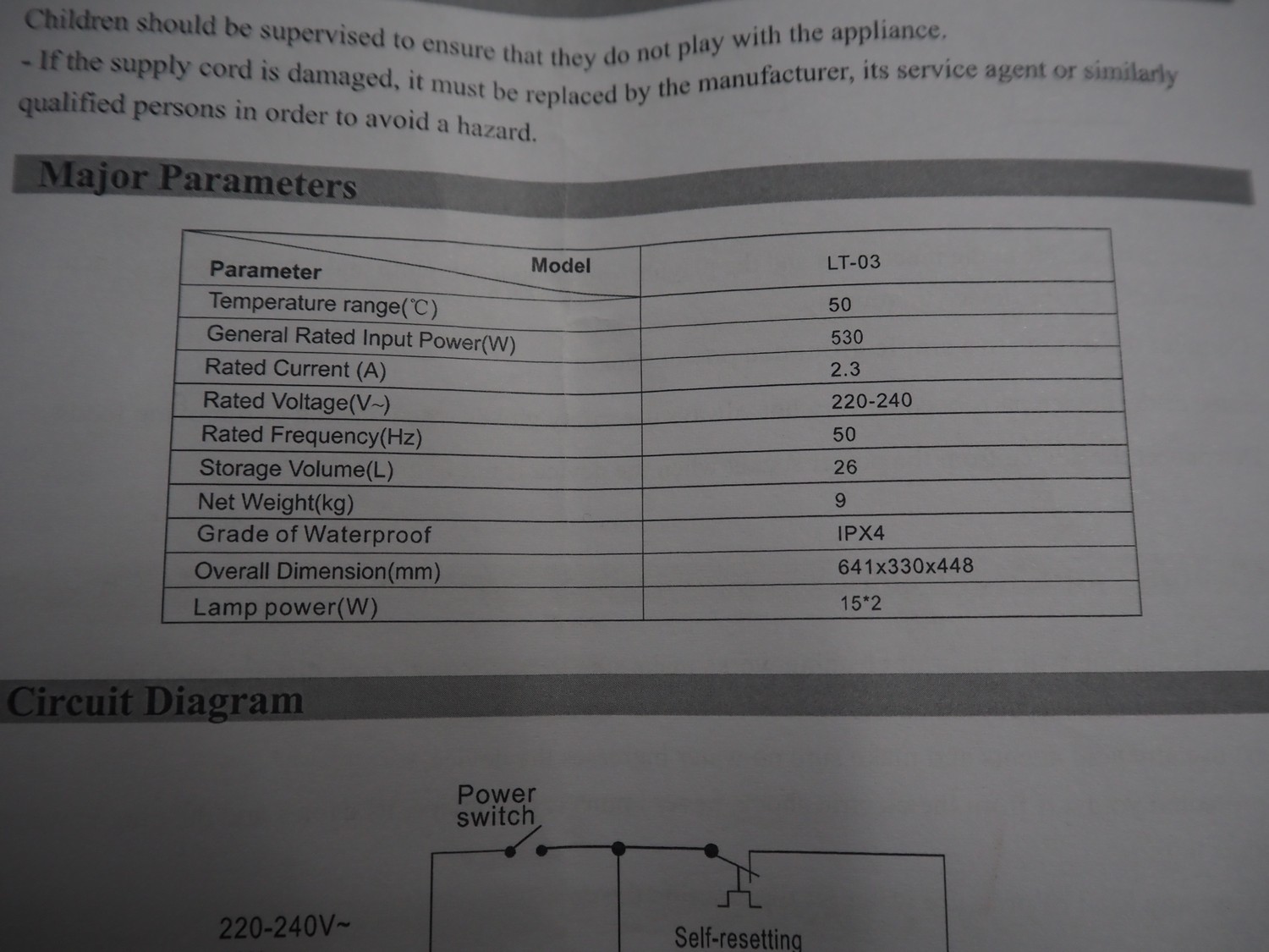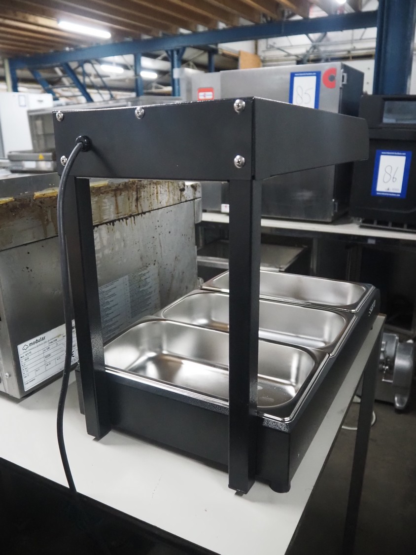 Saro Gastro-Products GmbH counter top food warmer, model: LT-03, 220-240 V, 50 Hz, 2.3 A, 530 W, weight: 9 kg, 3 gastronorm bins, bin dimensions: 300 mm x 170 mm x 60 mm, total dimensions: 650 mm x 330 mm x 440 mm.