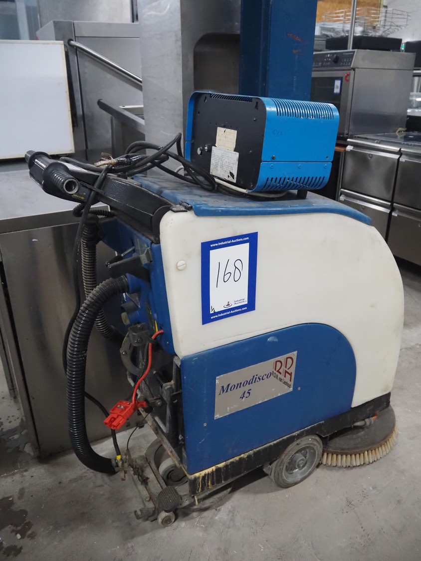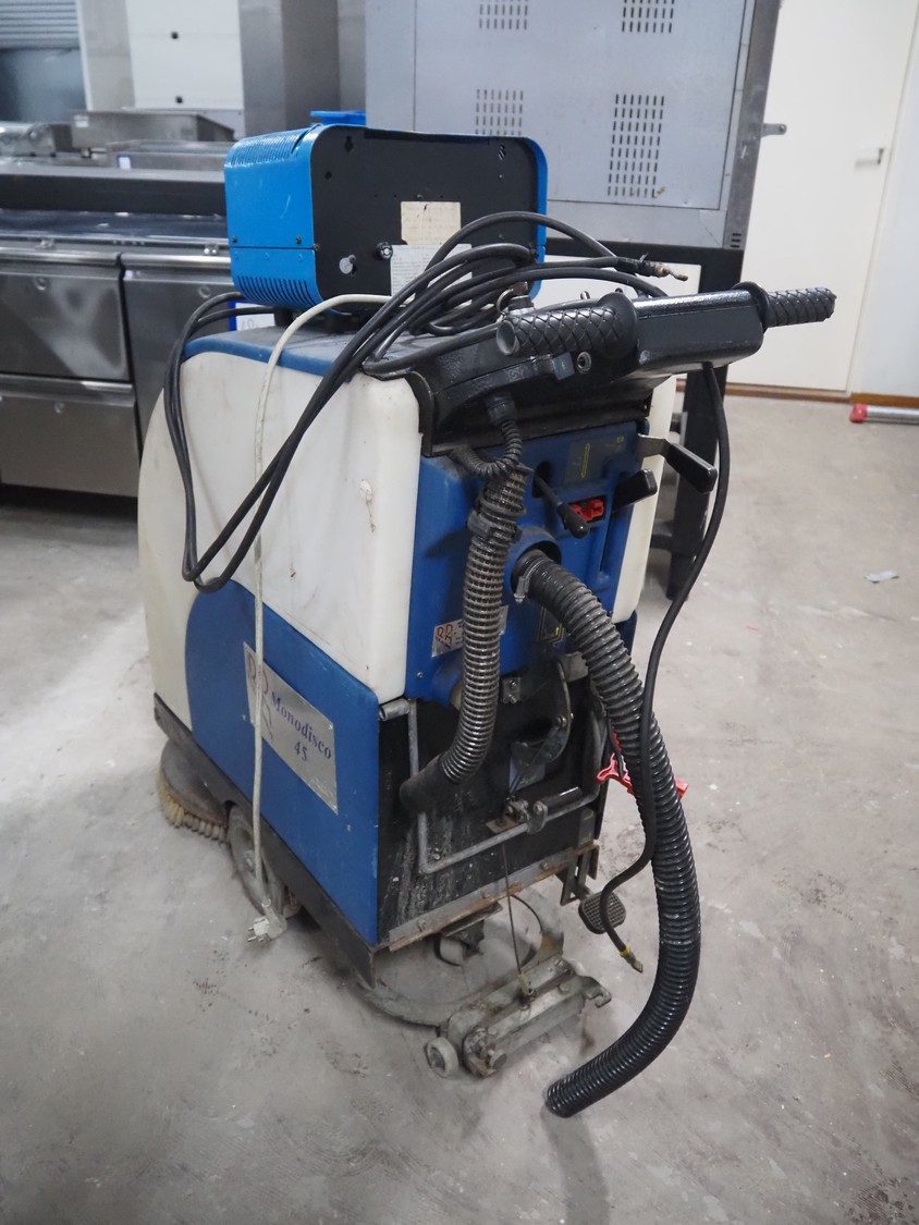 Monodisco floor scrubbing machine, diameter brush: Ø 400 mm, total dimensions: 1100 mm x 400 mm x 1050 mm. Including charger, type: E 24/17, serial number: 36316/0/0009/02/5, 230 V, 1 Ph, 50 Hz, 3.6 A. Missing the sweeping brush and technical condition unknown.