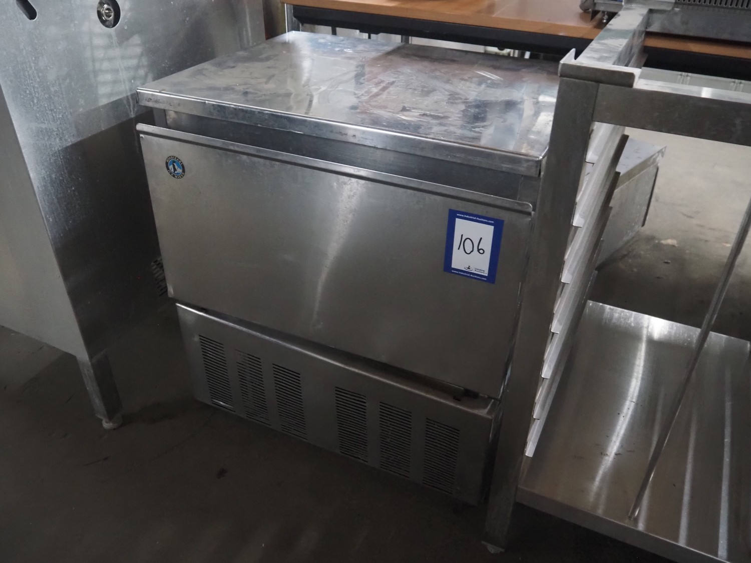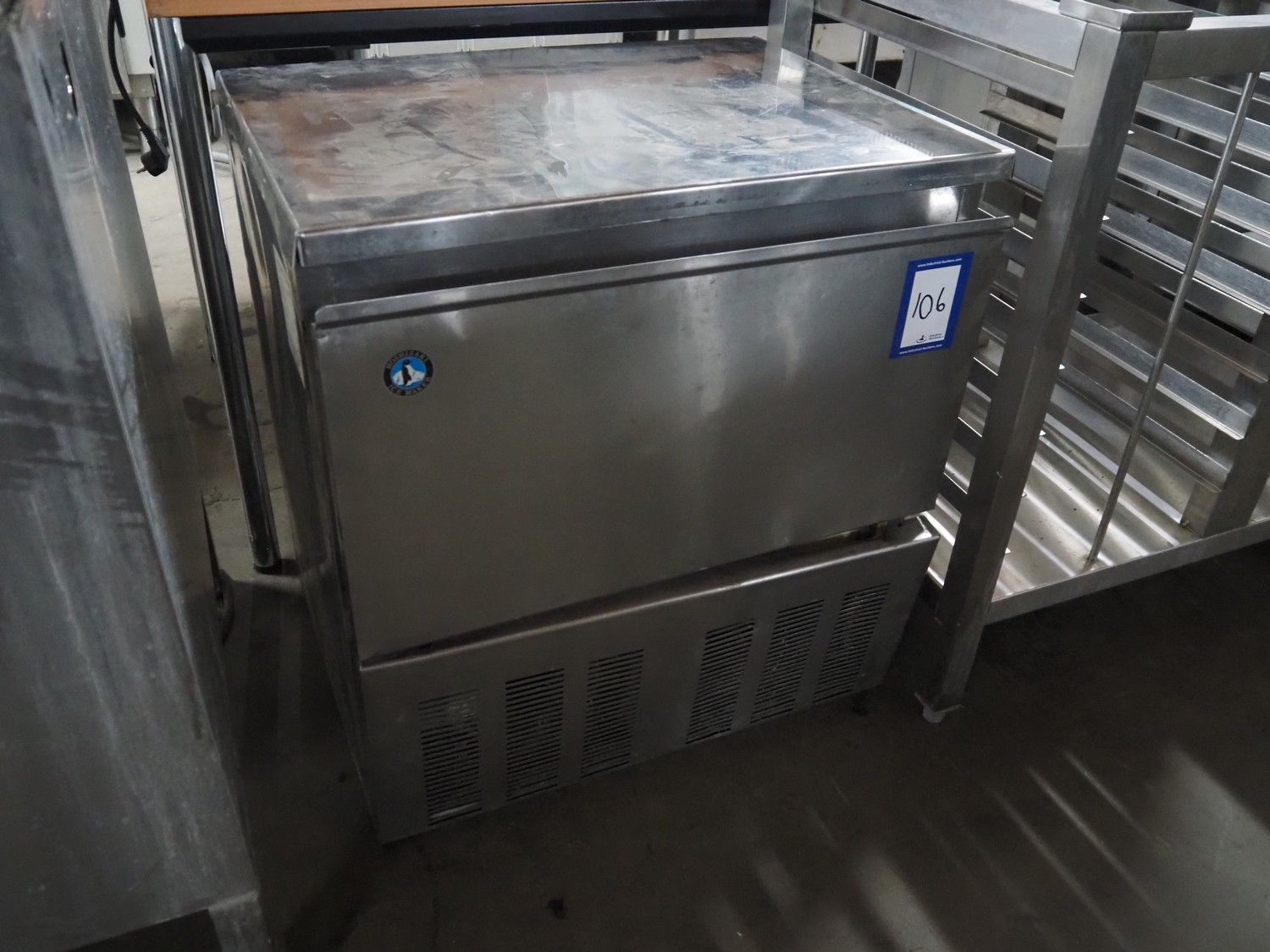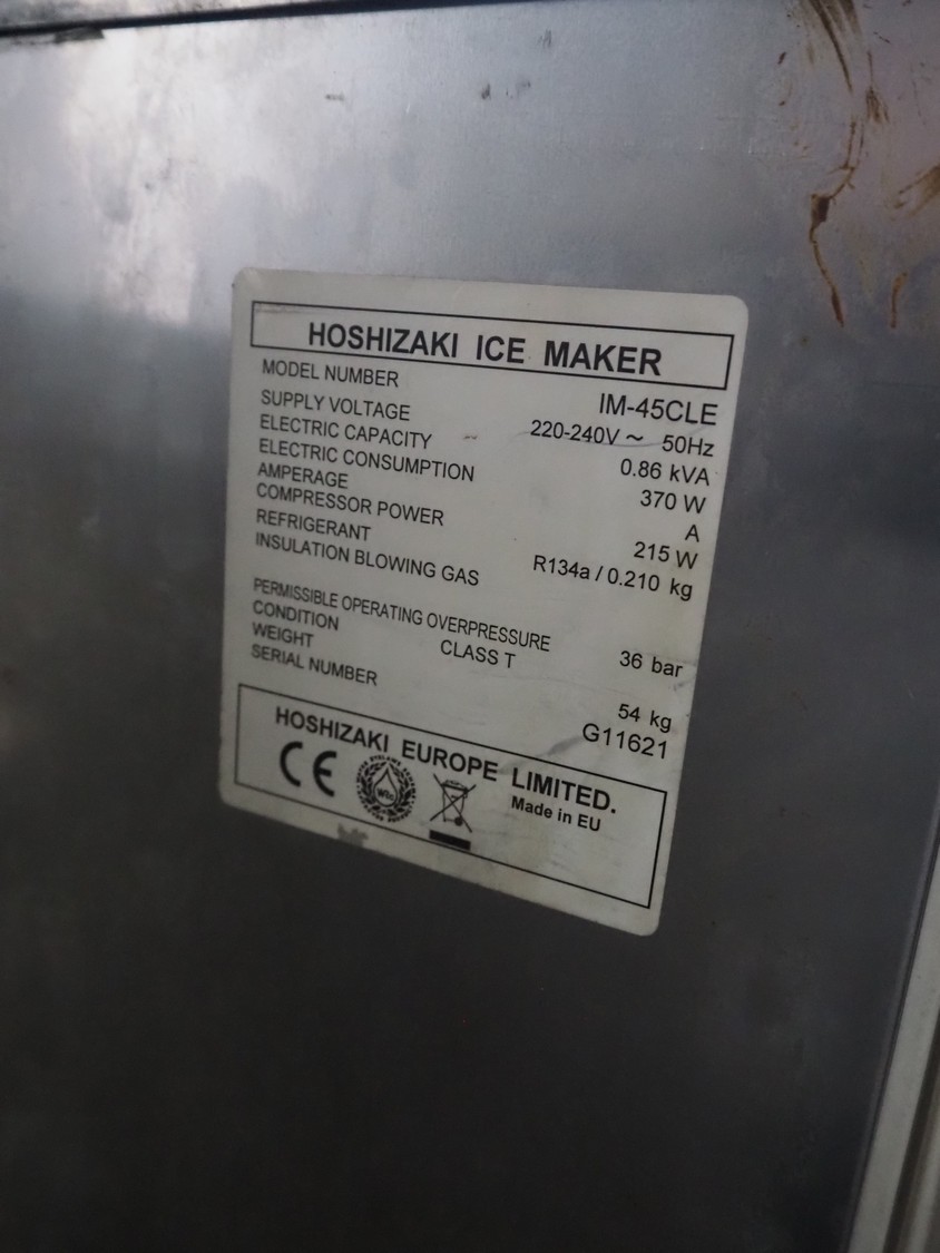 Hoshizaki ice cube machine, model: IM-45CLE, serial number: G11621, 220-240 V, 50 Hz, 370 W, refrigerant: R134A/0.210 kg, weight: 54 kg, inside dimensions: 560 mm x 400 mm x 340 mm, total dimensions: 630 mm x 500 mm x 700 mm.