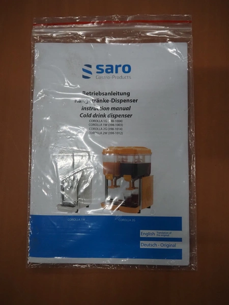 Saro Gastro-Products GmbH juice dispenser, model: 398-1005, serial number: KL24156AX2409D2436, year of construction: 2024.11, 220 V, 1 Ph, 50 Hz, 1.9 A, 0.29 kW, refrigerant: R290/0.030 kg, volume: 1.2 liter, dimensions: 430 mm x 220 mm x 650 mm.