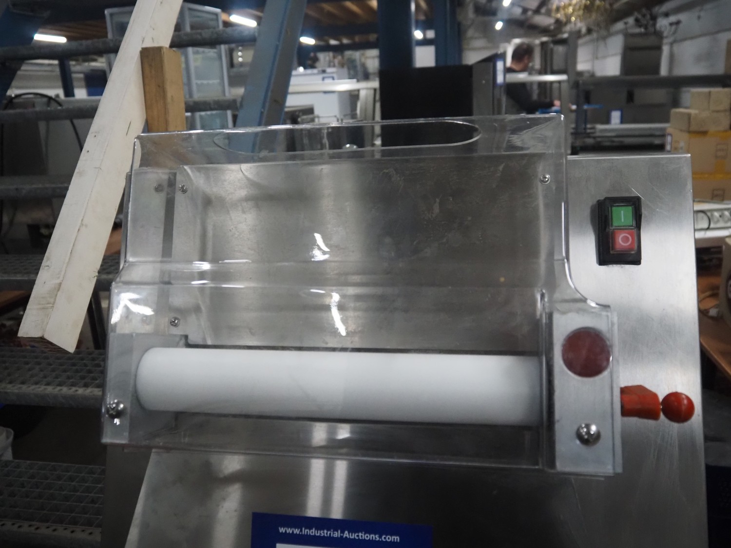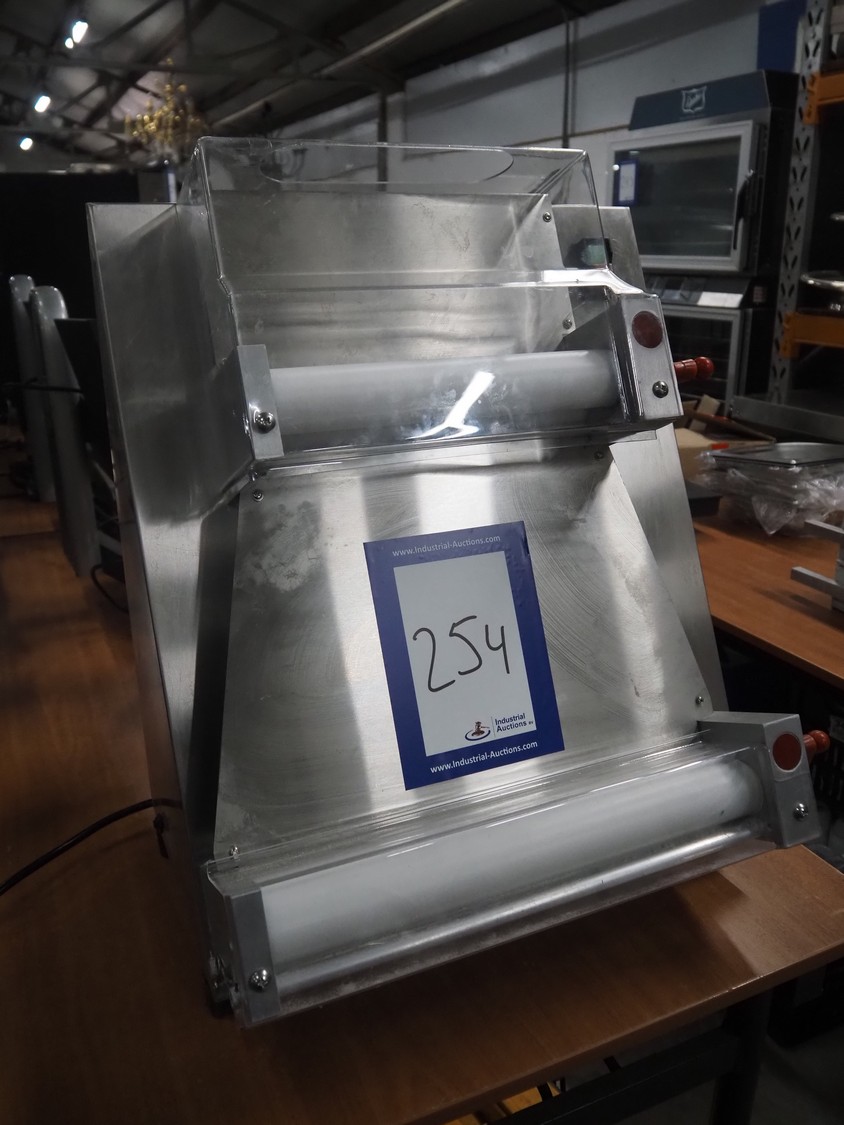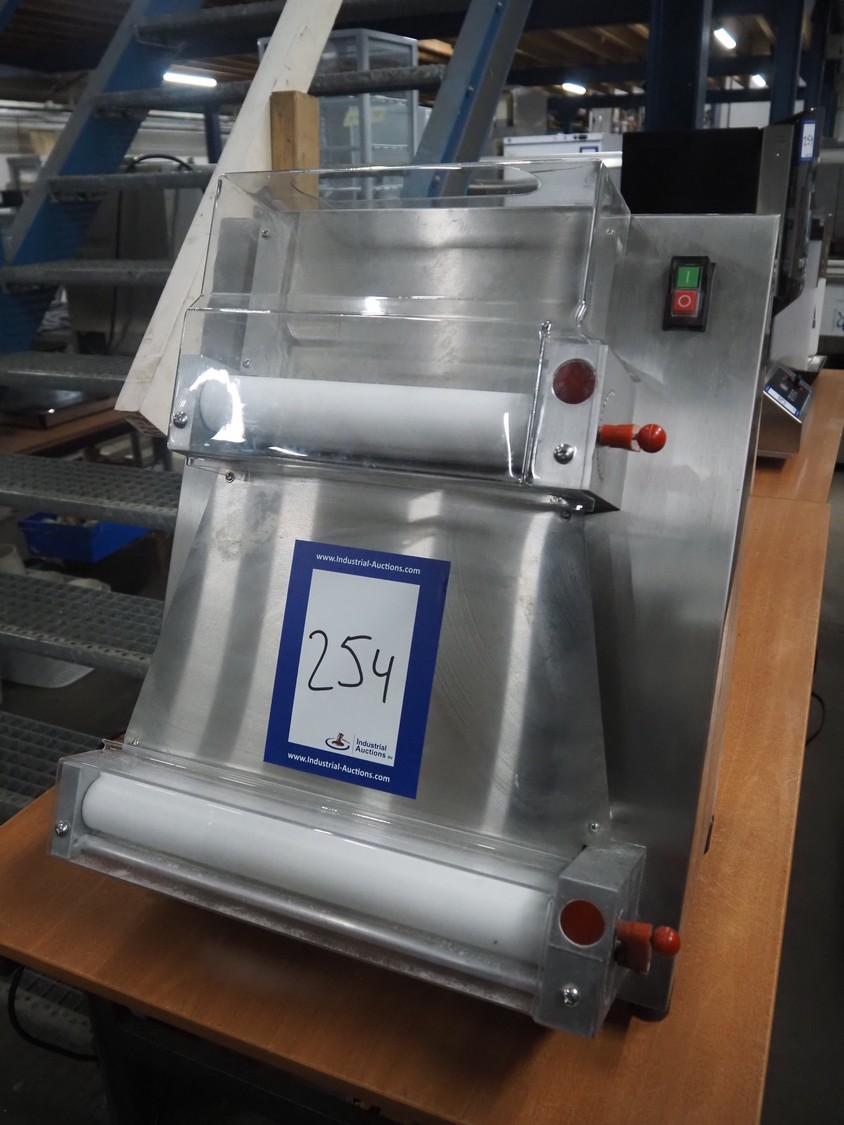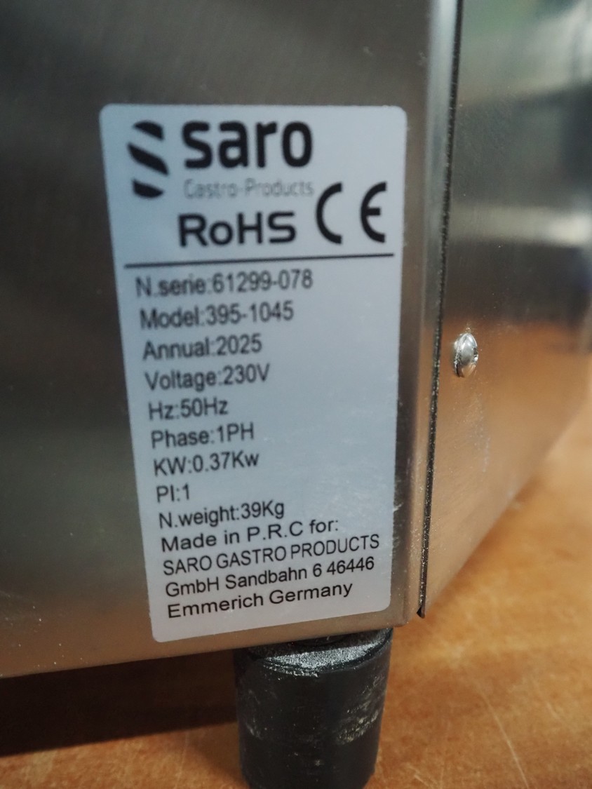 Saro Gastro-Products GmbH dough roller, model: 395-1045, serial number: 61299-078, year of construction: 2025, 230 V, 1 Ph, 50 Hz, 0.37 kW, weight: 39 kg, dimensions input: 200 mm x 40 mm, total dimensions: 600 mm x 500 mm x 620 mm.