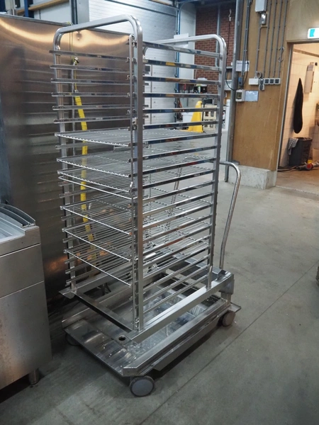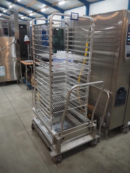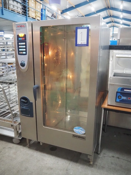 Rational combi steamer, model: SCC 202G, serial number: G22SG09072185304, year of construction: 2009, 230 V, 1 Ph, 50/60 Hz, gas heated, dimensions: 1100 mm x 1000 mm x 1800 mm. Including 2 s/s trolleys, (2x) 20 floors, floor dimensions: (20x) 660 mm x 540 mm, total dimensions: (2x) 970 mm x 740 mm x 1700 mm.