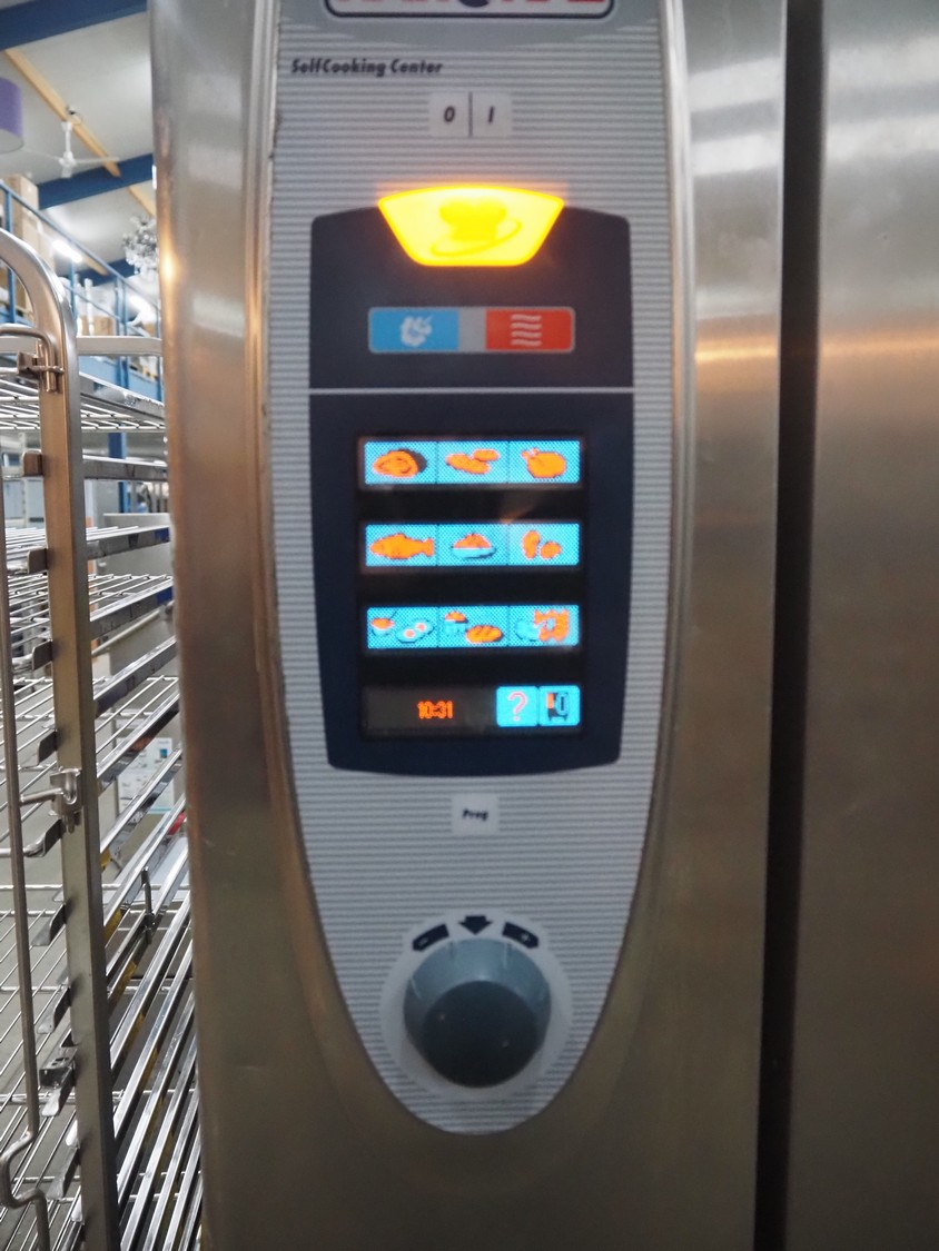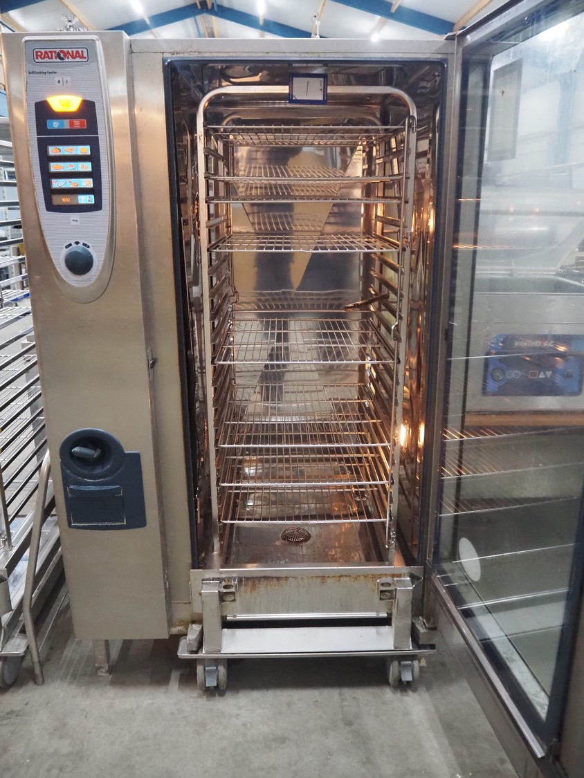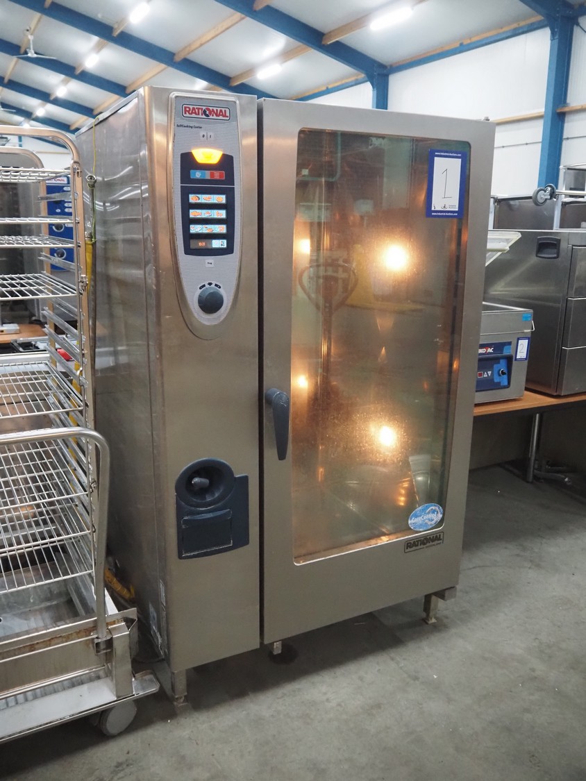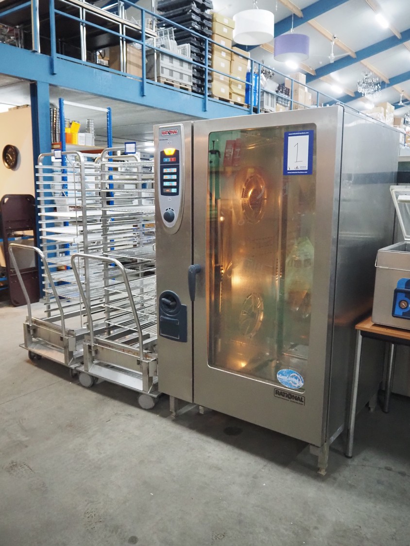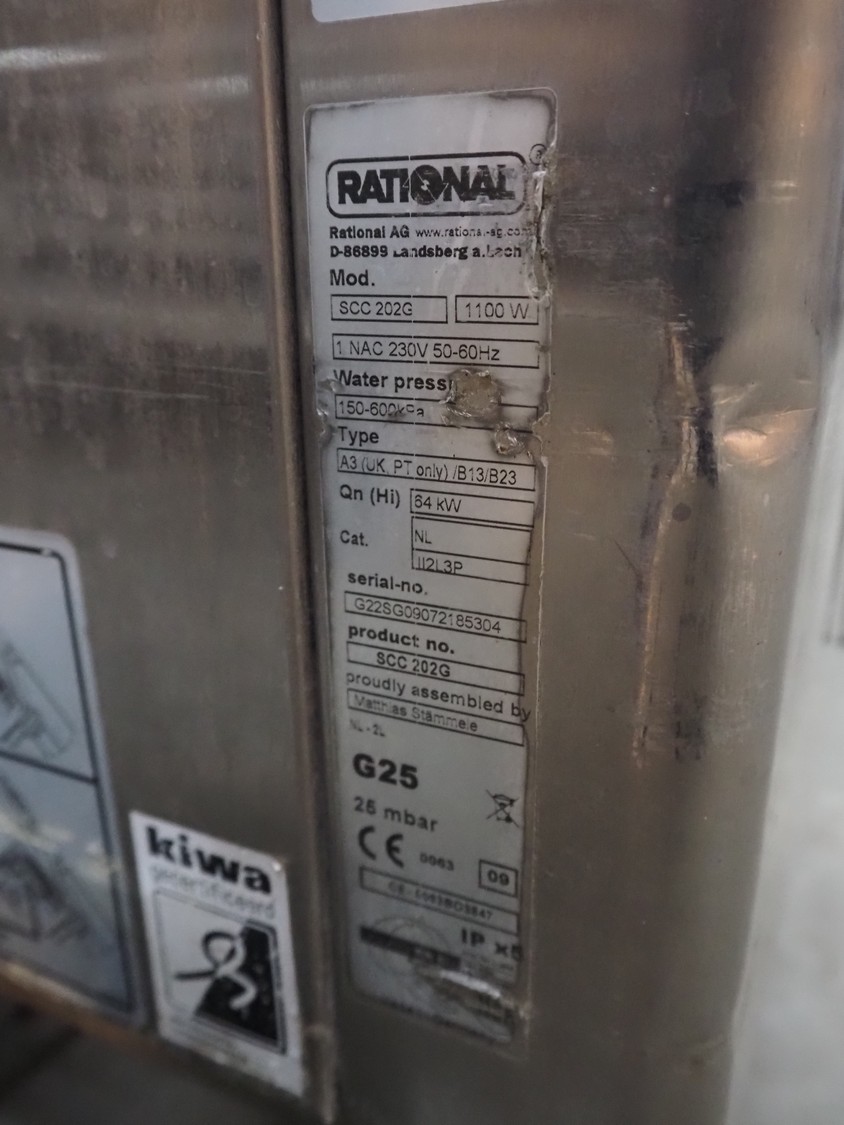 Rational combi steamer, model: SCC 202G, serial number: G22SG09072185304, year of construction: 2009, 230 V, 1 Ph, 50/60 Hz, gas heated, dimensions: 1100 mm x 1000 mm x 1800 mm. Including 2 s/s trolleys, (2x) 20 floors, floor dimensions: (20x) 660 mm x 540 mm, total dimensions: (2x) 970 mm x 740 mm x 1700 mm.