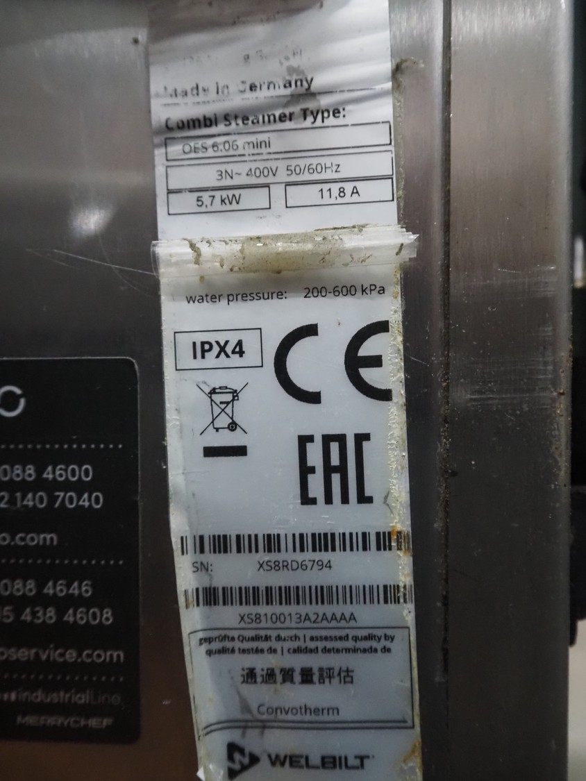 Convotherm combi steamer, type: OES 6.06 mini, serial number: XS810013A2AAAA, 400 V, 3 Ph, 50/60 Hz, 11.8 A, 5.7 kW, 3 floors, floor dimensions: 320 mm x 300 mm, total dimensions: 660 mm x 520 mm x 650 mm.