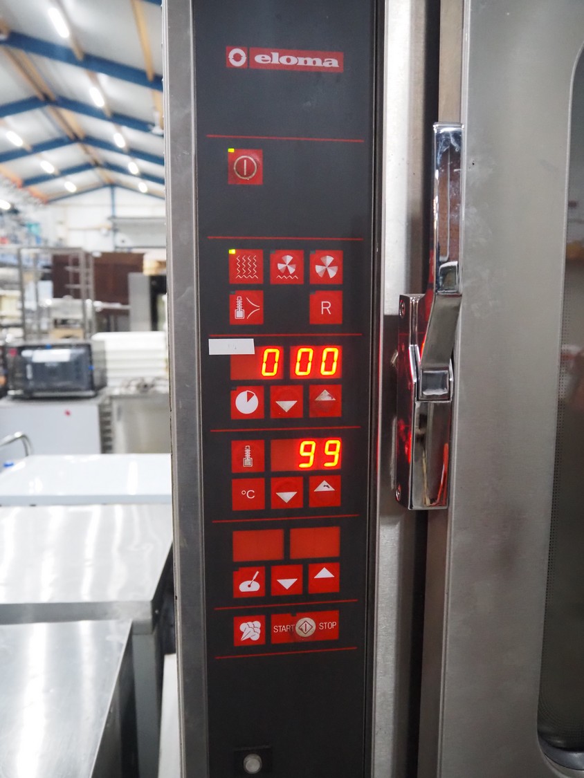 Eloma GmbH combi steamer, type: MMD 10-11 GAS, machine number: 144007 430, year of construction: 1996, 220 V, 1 Ph, 50 Hz, 0.3 kW, 10 floors, floor dimensions: 530 mm x 300 mm, total dimensions: 950 mm x 790 mm x 1500 mm.