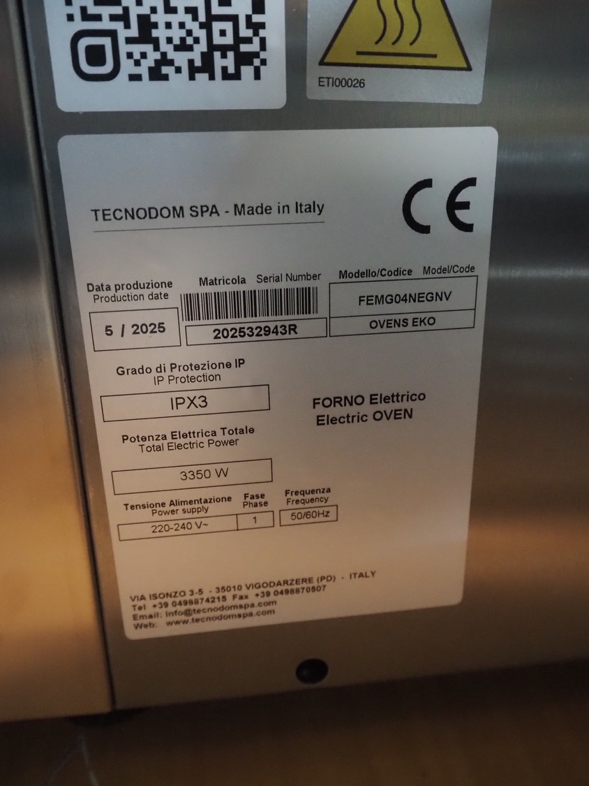 Saro Gastro-Products GmbH electric oven, model: FEMG04NEGNV, serial number: 202532943R, year of construction: 05-2025, 220-240 V, 1 Ph, 50/60 Hz, 350 W, i4 floors, floor dimensions: 540 mm x 300 mm, total dimensions: 700 mm x 670 mm x 600 mm.