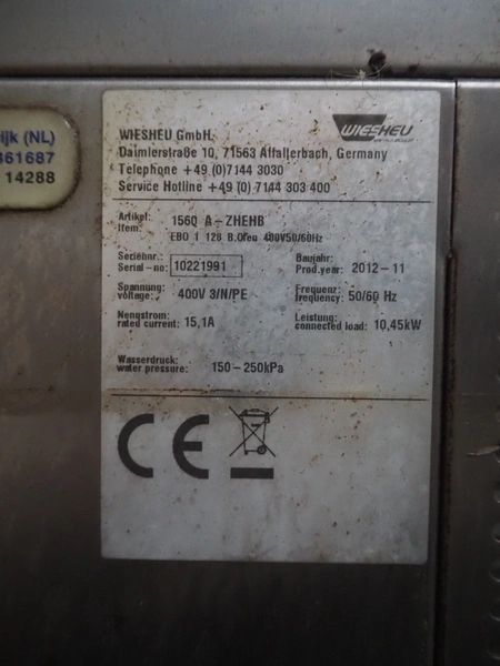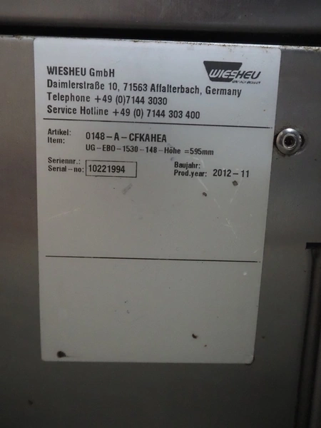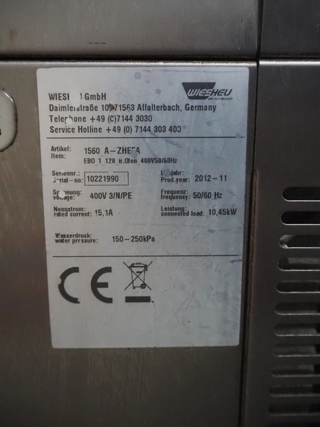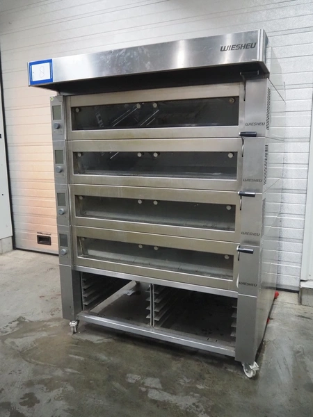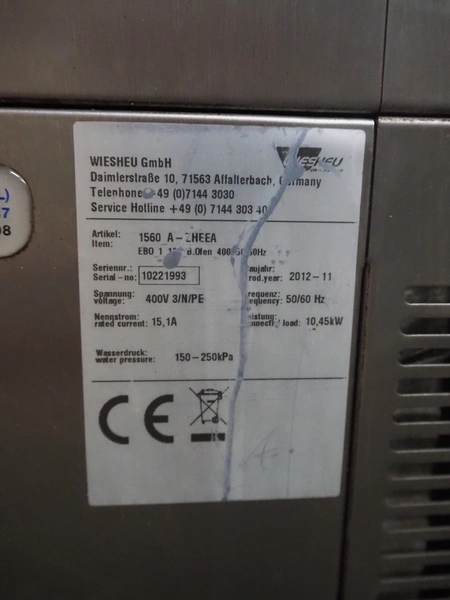 Wiesheu GmbH mobile deck oven, type: EBO 1 128 B, serial numbers: 10221990/10221991/10221992/10221993, year of construction: 2012-11, 400 V, 3 Ph, 50/60 Hz, 15.1 A, 10.45 kW, 4 decks, deck dimensions: 1200 mm x 1000 mm x 150 mm, total dimensions: 1550 mm x 1550 mm x 2080 mm.
