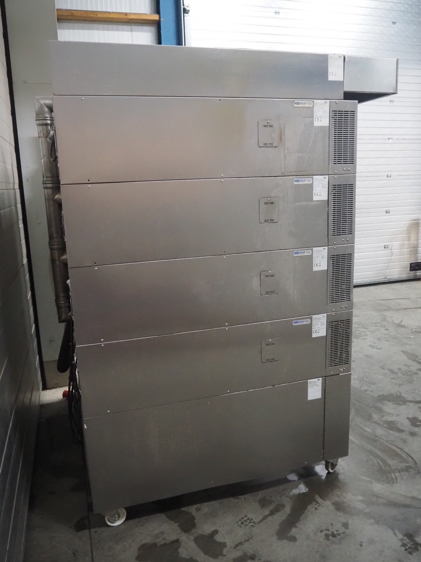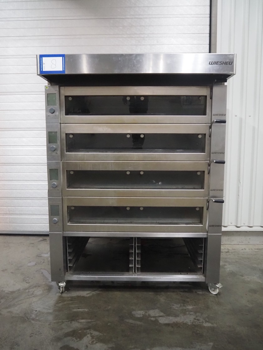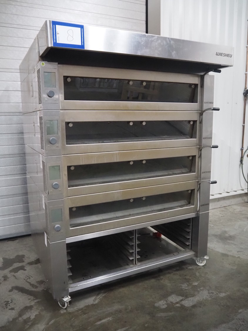 Wiesheu GmbH mobile deck oven, type: EBO 1 128 B, serial numbers: 10221990/10221991/10221992/10221993, year of construction: 2012-11, 400 V, 3 Ph, 50/60 Hz, 15.1 A, 10.45 kW, 4 decks, deck dimensions: 1200 mm x 1000 mm x 150 mm, total dimensions: 1550 mm x 1550 mm x 2080 mm.
