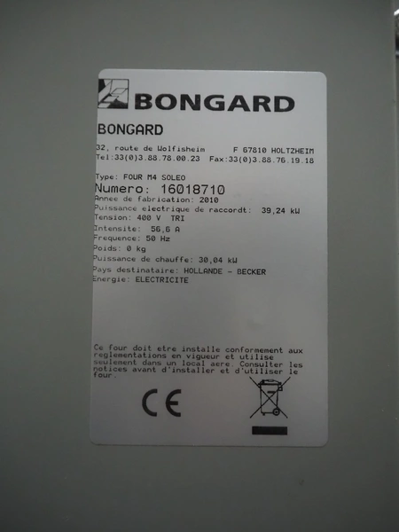 Bongard mobile deck oven, type: FOUR M4 SOLEO, serial number: 16018709, year of construction: 2010, 400 V, 3 Ph, 50 Hz, 26.6 A, 39.24 kW, 4 decks, deck dimensions (4x): 1370 mm x 950 mm, total dimensions: 1720 mm x 1900 mm x 1700 mm.