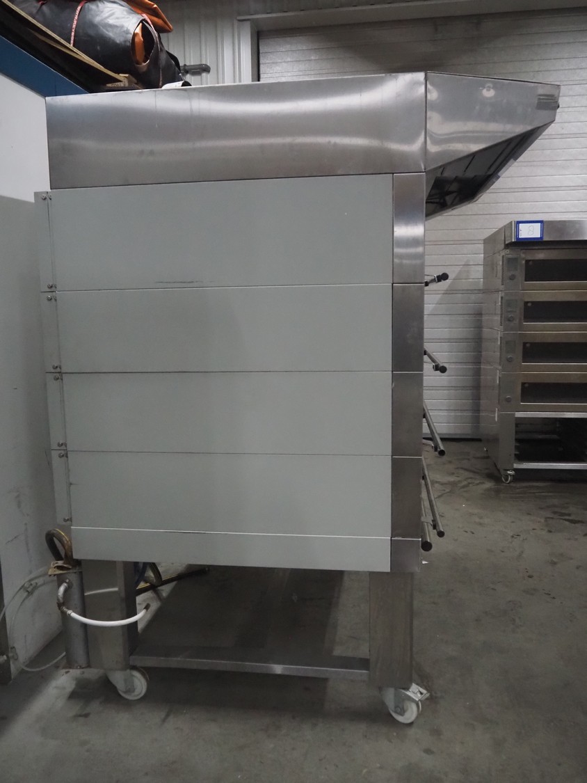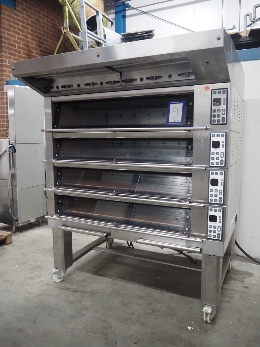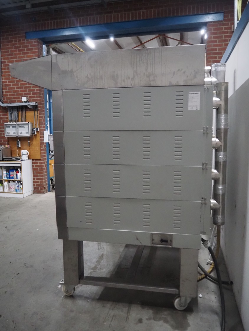 Bongard mobile deck oven, type: FOUR M4 SOLEO, serial number: 16018709, year of construction: 2010, 400 V, 3 Ph, 50 Hz, 26.6 A, 39.24 kW, 4 decks, deck dimensions (4x): 1370 mm x 950 mm, total dimensions: 1720 mm x 1900 mm x 1700 mm.