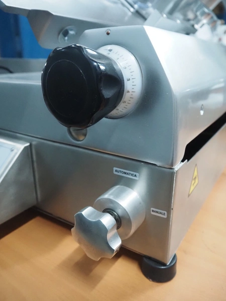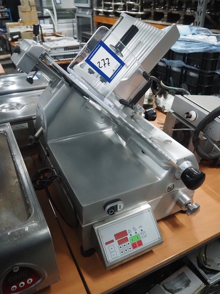 Saro Gastro-Products GmbH slicer, type: F 350 I, number: 22010221, year of construction: 2022, 230 V, 50 Hz, 0.370 kW, dimensions: 750 mm x 500 mm x 650 mm.