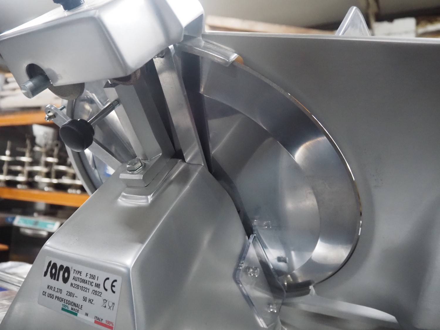 Saro Gastro-Products GmbH slicer, type: F 350 I, number: 22010221, year of construction: 2022, 230 V, 50 Hz, 0.370 kW, dimensions: 750 mm x 500 mm x 650 mm.