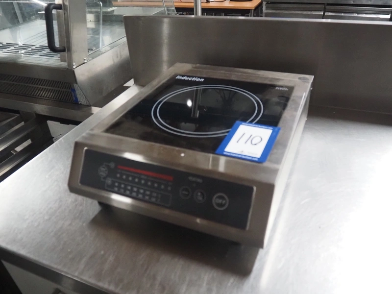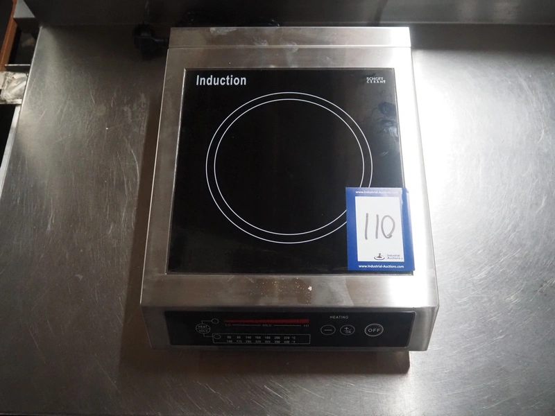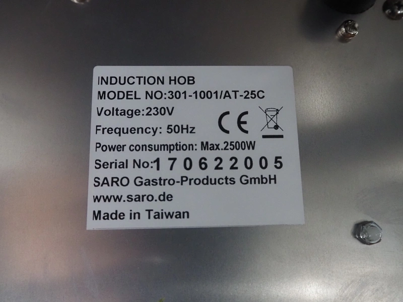 Saro Gastro-Products GmbH induction hob, model: 301-1001/AT-25C, serial number: 170622005, 230 V, 50 Hz, 2500 W, dimensions plate: 280 mm x 270 mm, total dimensions: 420 mm x 330 mm x 100 mm.