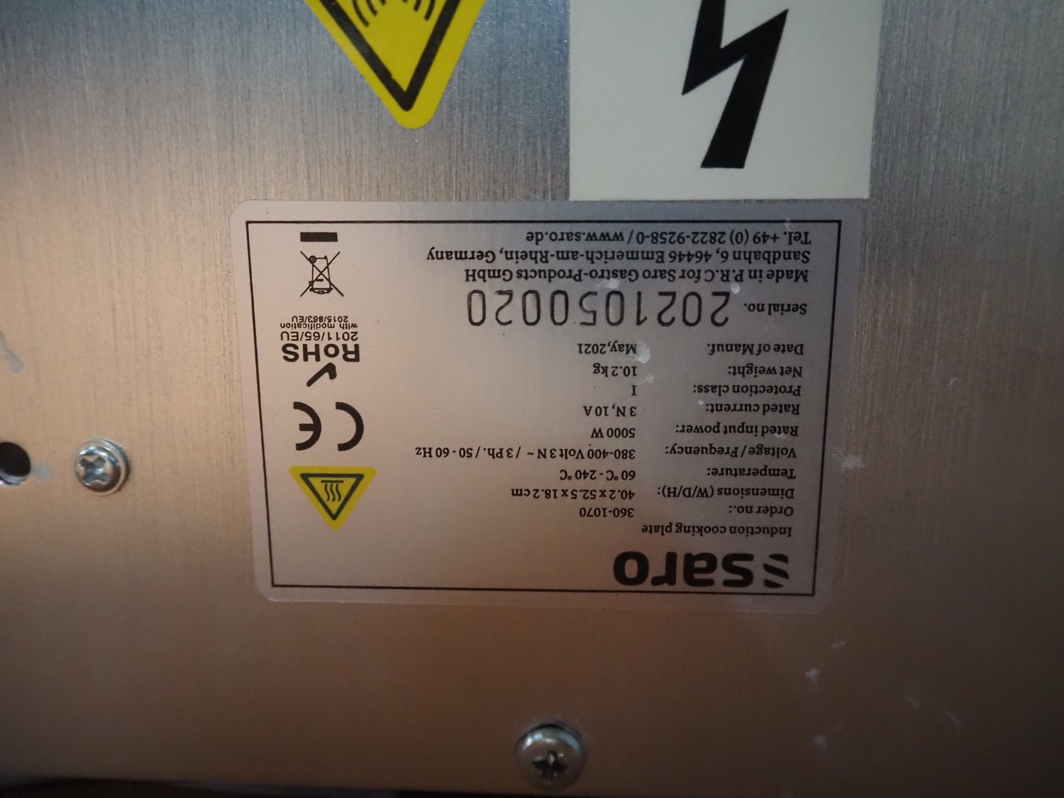 Saro Gastro-Products GmbH induction plate, serial number: 2021050020, year of construction: May 2021, 380-400 V, 3 Ph, 50-60 Hz, 10 A, 5000 W, temperature range: 60 °C - 240 °C, weight: 10.2 kg, dimensions: 540 mm x 400 mm x 180 mm