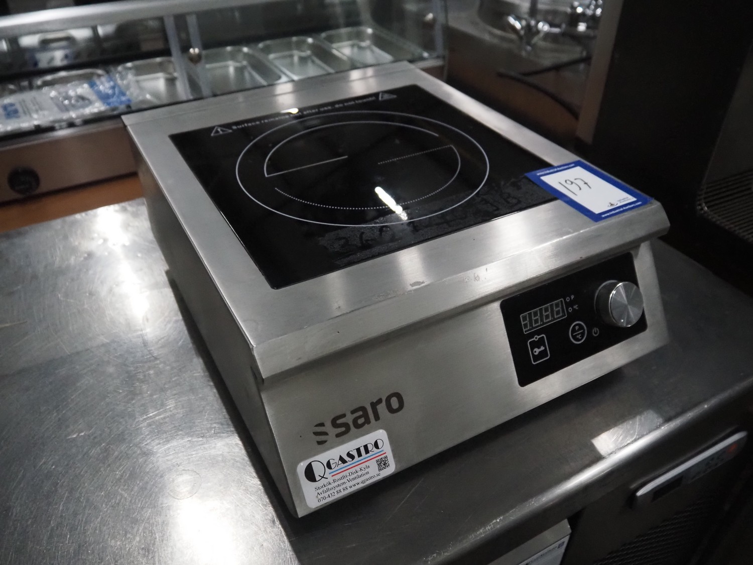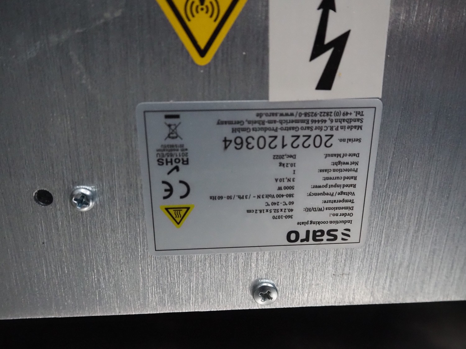 Saro Gastro-Products GmbH induction plate, serial number: 2022120364, year of construction: December 2022, 380-400 V, 3 Ph, 50-60 Hz, 10 A, 5000 W, weight: 10.2 kg, dimensions induction plate: 320 mm x 300 mm, total dimensions: 540 mm x 400 mm x 200 mm.