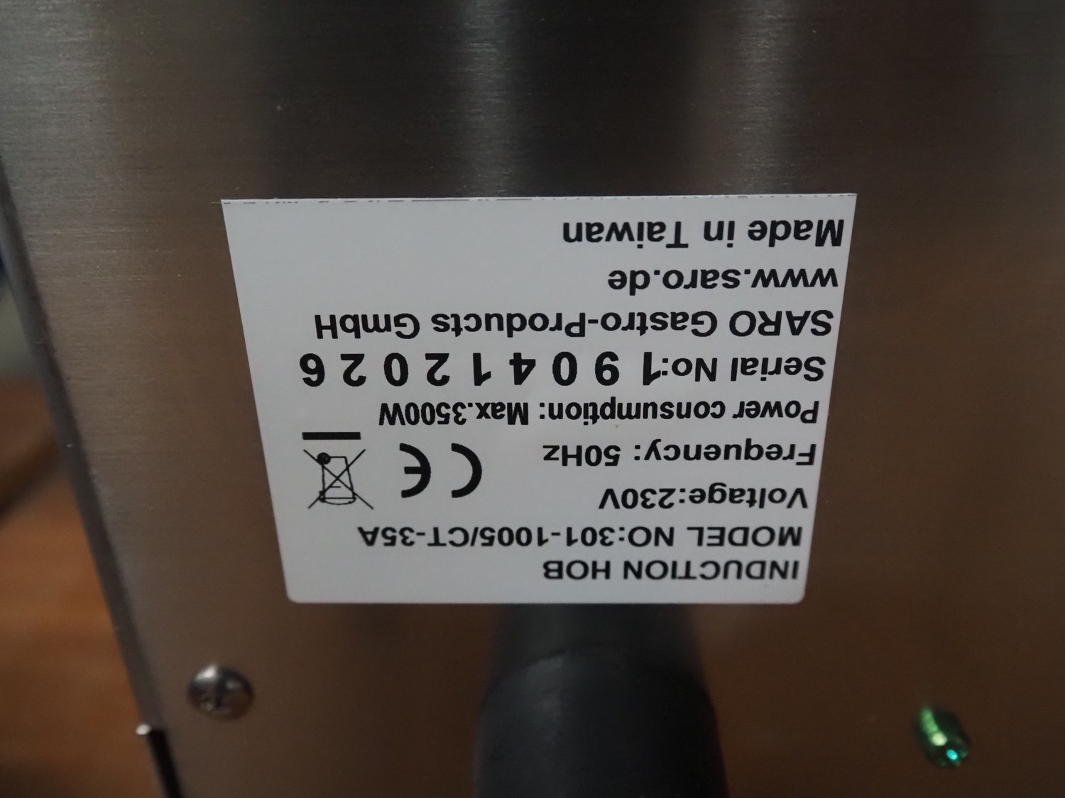 Saro Gastro-Products GmbH induction hob, model: 301-1005/CT-35A, serial number: 190412026, 230 V, 50 Hz, 3500 W, dimensions: 490 mm x 380 mm x 200 mm. Including pan.