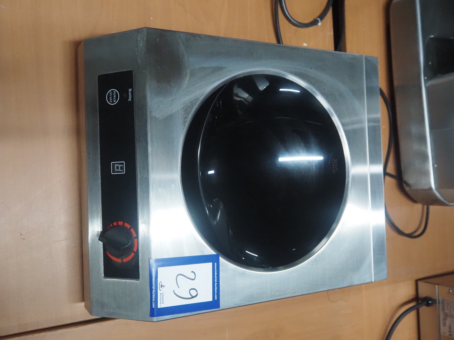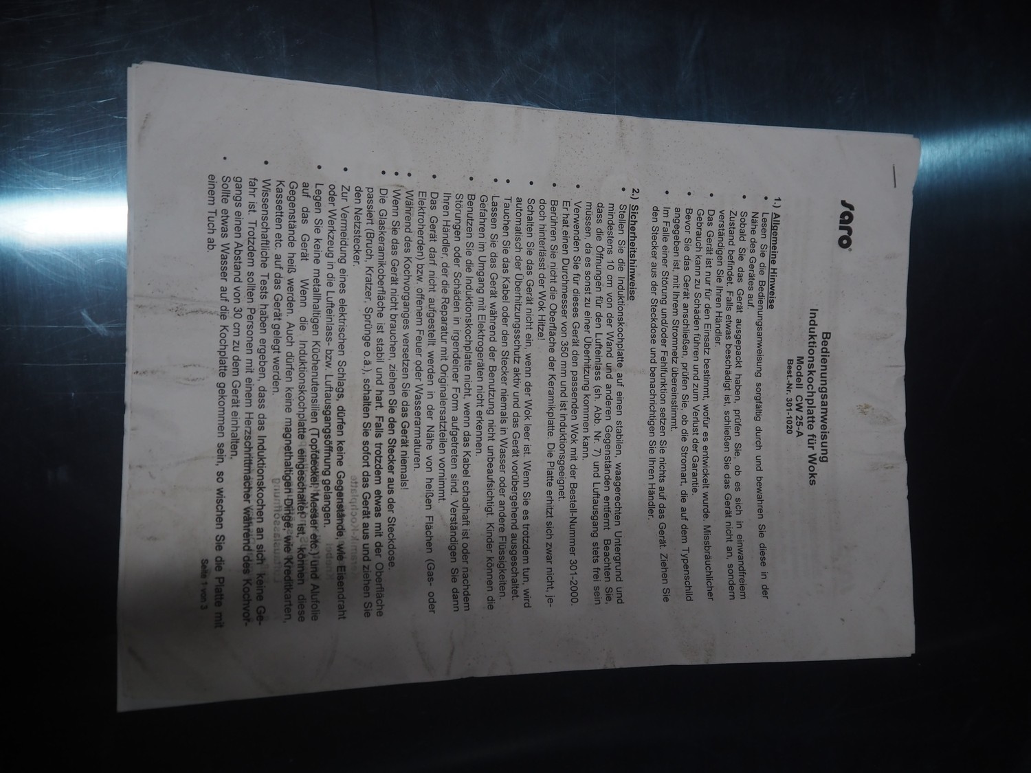 Saro Gastro-Products GmbH induction hob, model: 301-1020/CW-25A, serial number: 190814038, 230 V, 50 Hz, 2500 W, dimensions: 490 mm x 380 mm x 160 mm. Including pan.