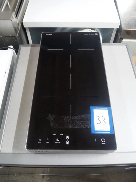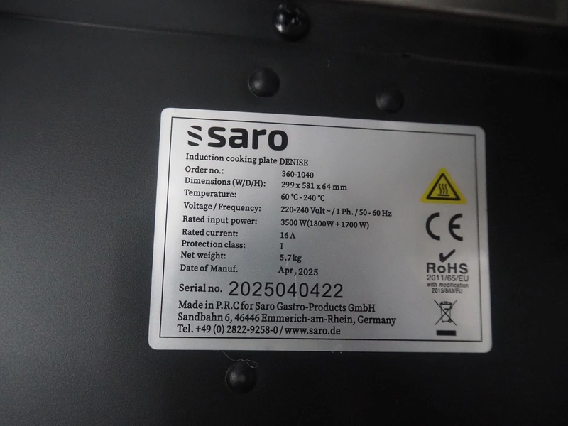 Saro Gastro-Products GmbH induction plate, type: DENISE, serial number: 2025040422, year of construction: April 2025, 220-240 V, 1 Ph, 50-60 Hz, 16 A, 3500 W, weight: 5.7 kg, dimensions: 580 mm x 300 mm x 60 mm.
