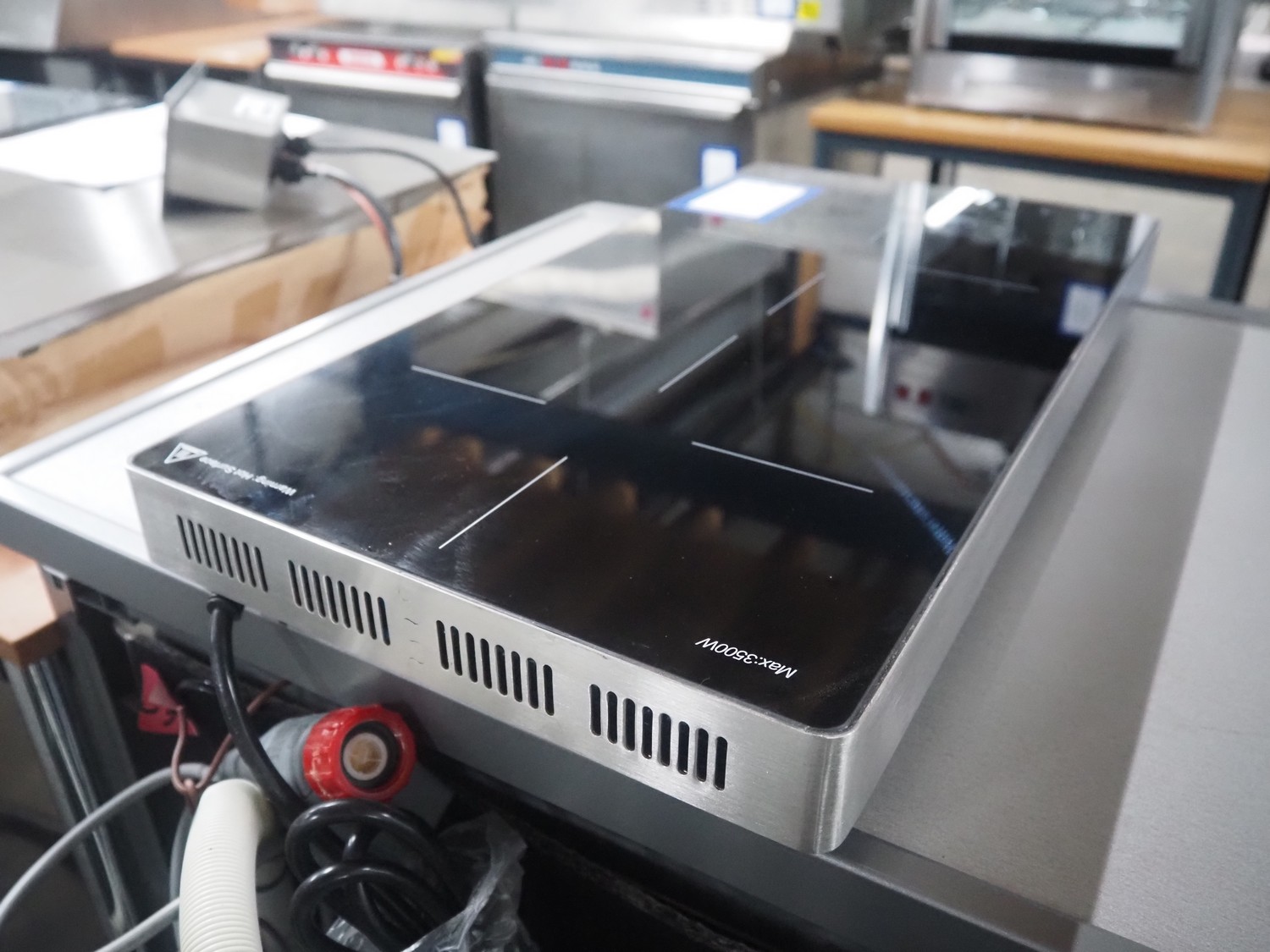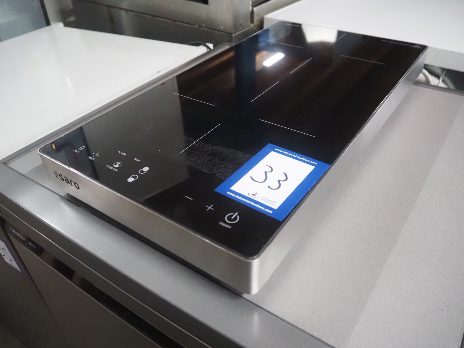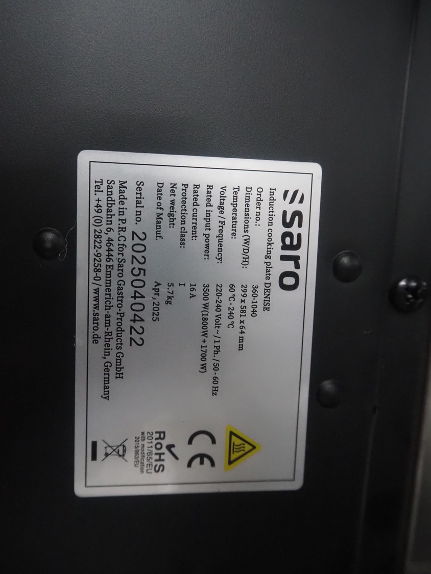 Saro Gastro-Products GmbH induction plate, type: DENISE, serial number: 2025040422, year of construction: April 2025, 220-240 V, 1 Ph, 50-60 Hz, 16 A, 3500 W, weight: 5.7 kg, dimensions: 580 mm x 300 mm x 60 mm.