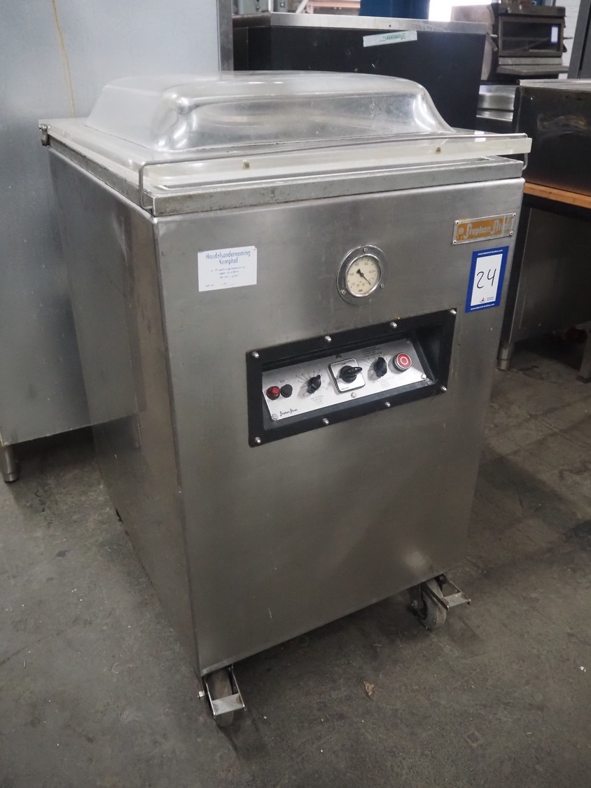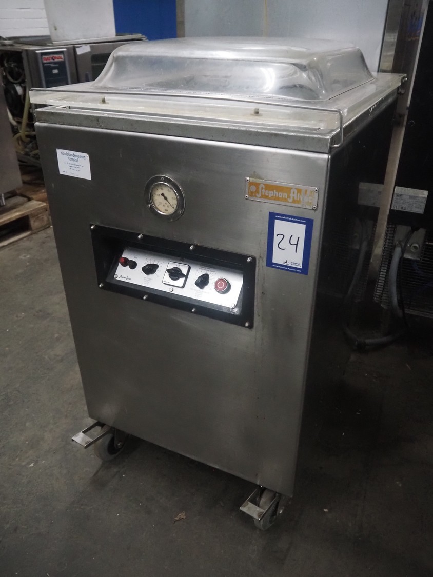 Stephan Alvac vacuum machine, type: ALVAC II SM, machine number: 8107-2061, 220-280 V, 3 Ph, 6.3-3.7 A, 1.5 kW, seal length: (2x) 500 mm, total dimensions: 750 mm x 600 mm x 1100 mm.