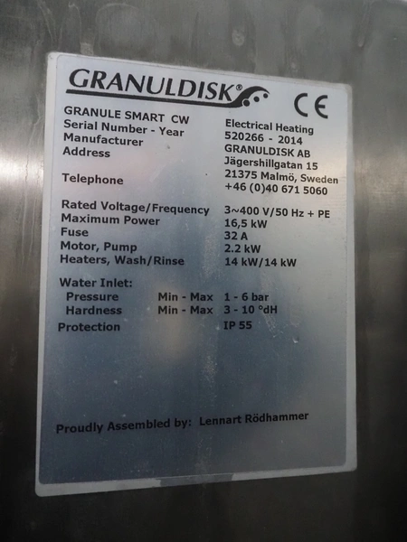 Granuldisk tool washing machine, model: Granule Smart CW, serial number: 520266, year of construction: 2014, 400 V, 3 Ph, 50 Hz, 32 A, 16.5 kW, dimensions: 1060 mm x 900 mm x 1740 mm.
