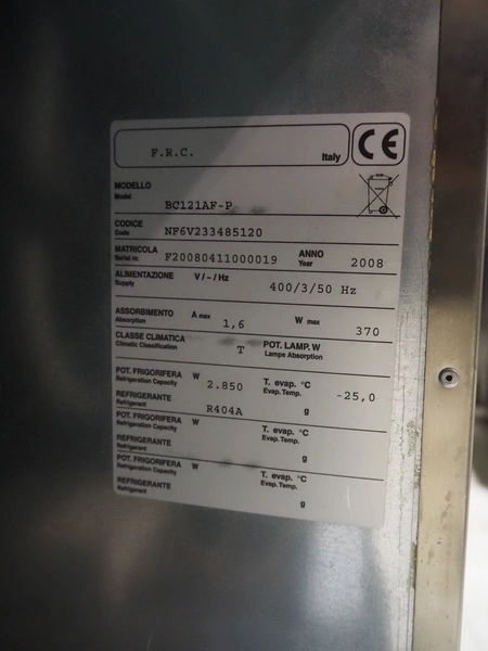 VDW Cool systems blast chiller, model: BC121AF-P, serial number: F20080411000019, year of construction: 2008, 400 v, 3 Ph, 50 Hz, 1.6 A, 370 w, refrigerant: R404A, 12 floors, floor dimensions: 610 mm x 420 mm. Without cooling motor.
