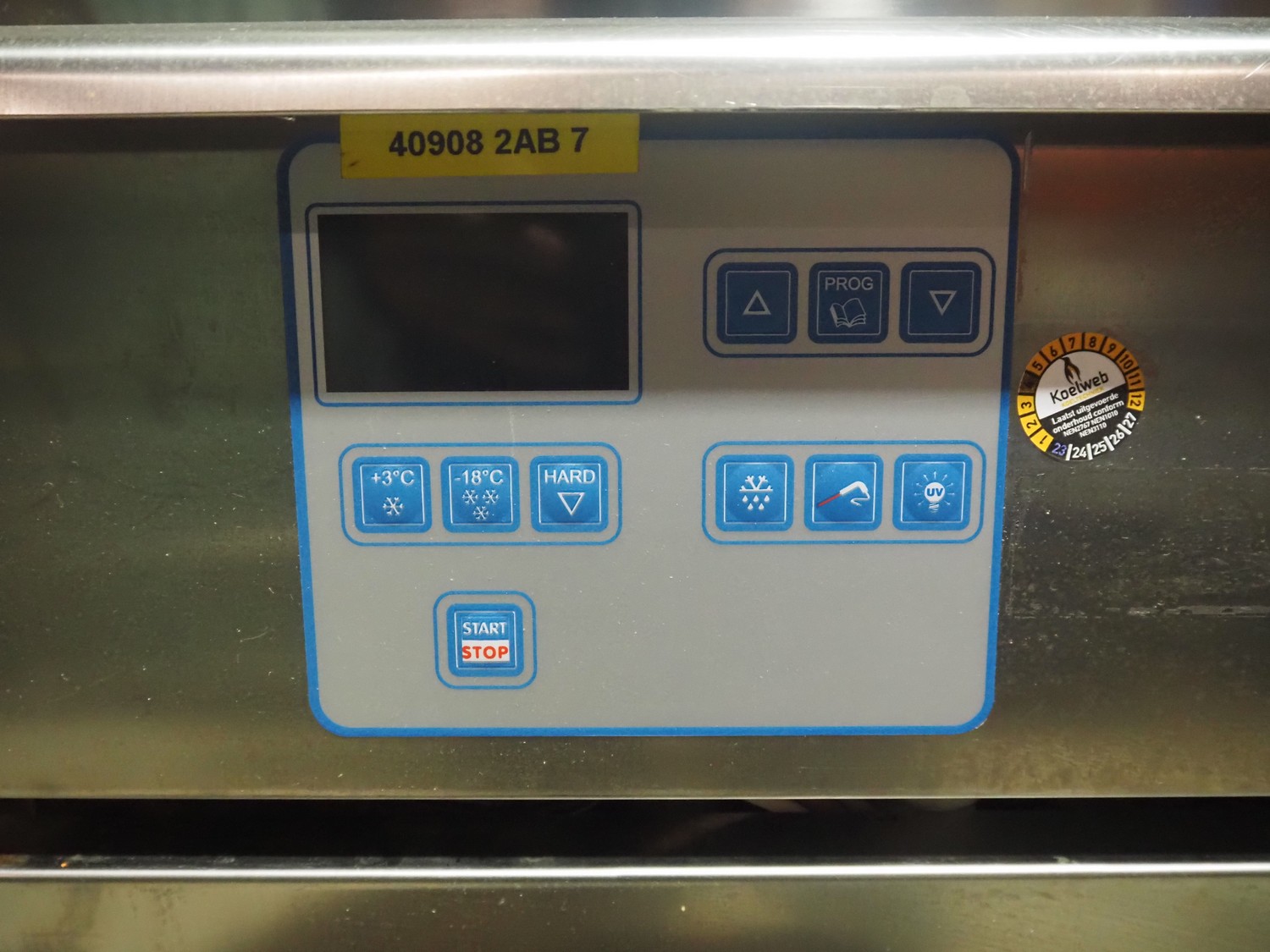 VDW Cool systems blast chiller, model: BC121AF-P, serial number: F20080411000019, year of construction: 2008, 400 v, 3 Ph, 50 Hz, 1.6 A, 370 w, refrigerant: R404A, 12 floors, floor dimensions: 610 mm x 420 mm. Without cooling motor.