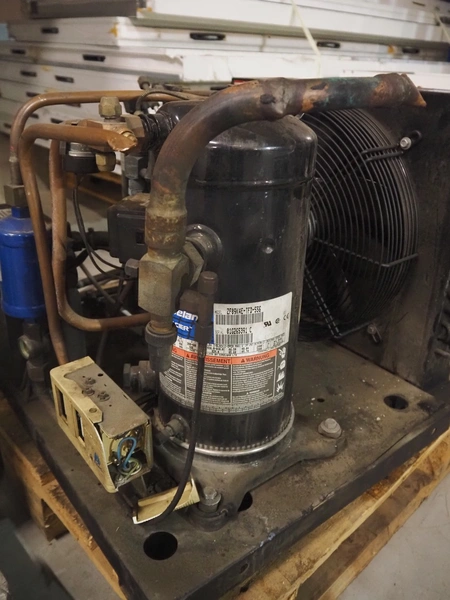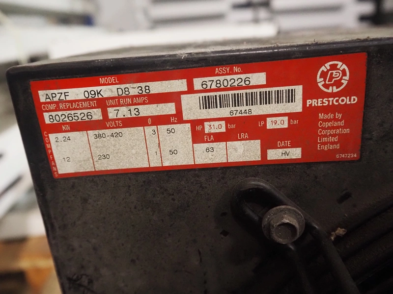 Prestcold cooling compressor, model: APZF 09K D8 38, number: 6780226, 380-420 V, 3 Ph, 50 Hz, 2.24 kW, dimensions: 620 mm x 660 mm x 480 mm.