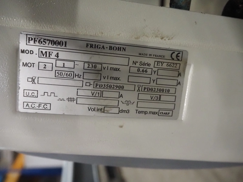 Friga-Bohn evaporator, model: MF 4, serial number: EY 6622, 230 V, 1 mPh, 50/60 Hz, dimensions: 600 mm x 440 mm x 180 mm.
