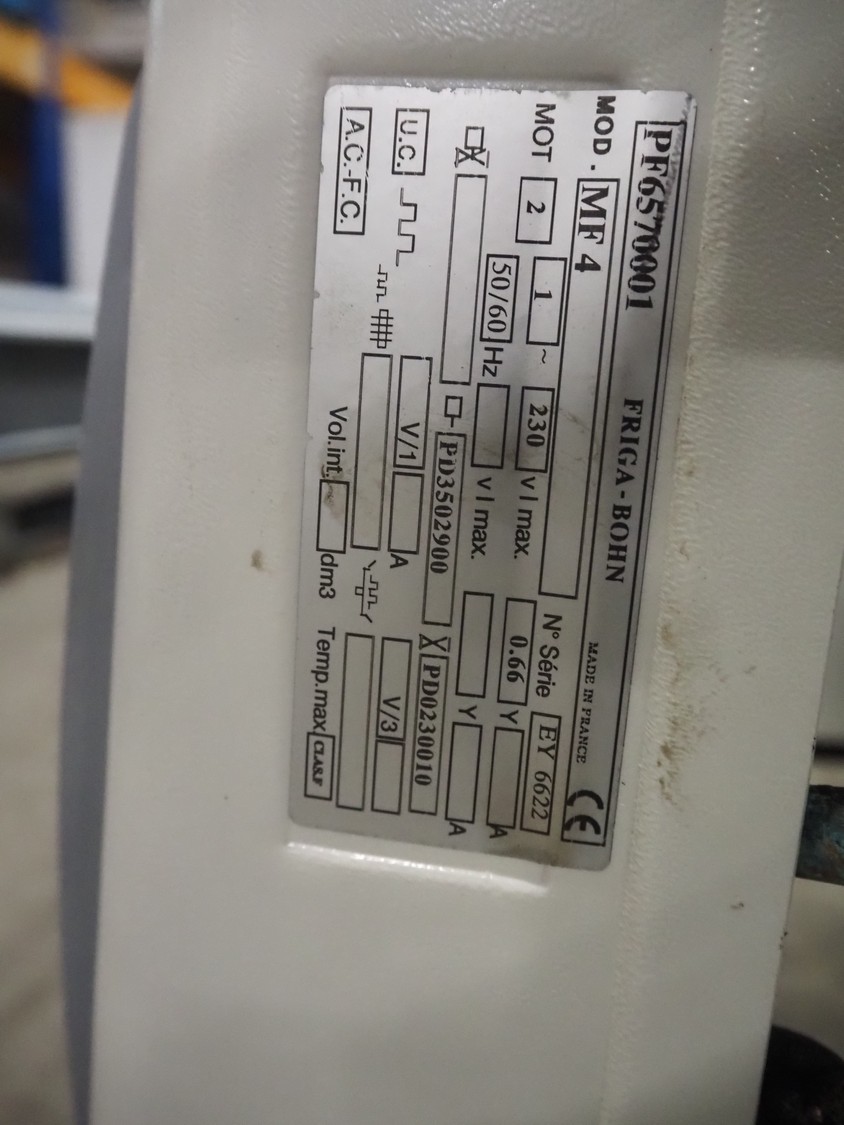 Friga-Bohn evaporator, model: MF 4, serial number: EY 6622, 230 V, 1 mPh, 50/60 Hz, dimensions: 600 mm x 440 mm x 180 mm.