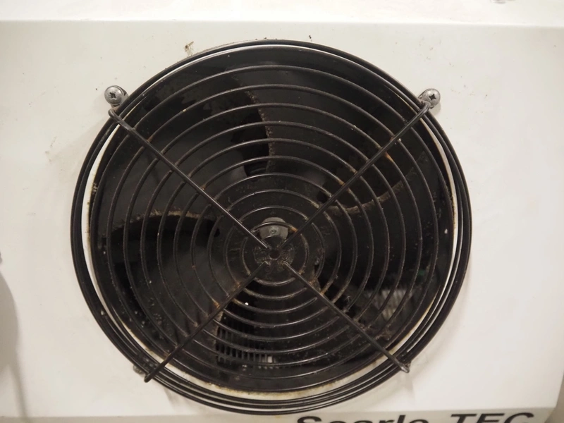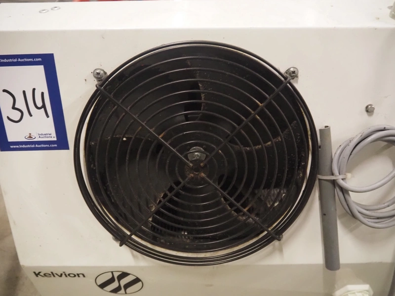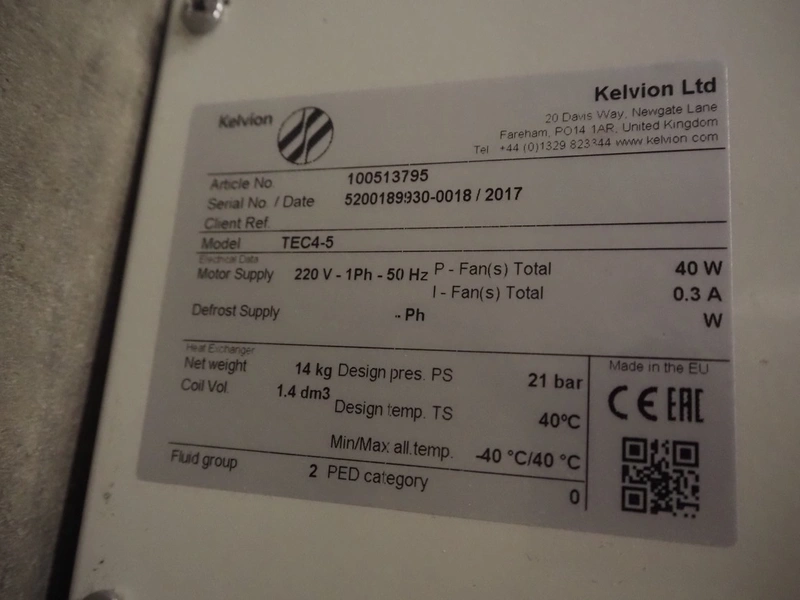 Kelvion evaporator, model: TEC4-5, serial number: 5200189930-0018, year of construction: 2017, 220 V, 1 Ph, 50 Hz, 0.3 A, 40 W, 2 fans, dimensions: 870 mm x 170 mm x 380 mm.