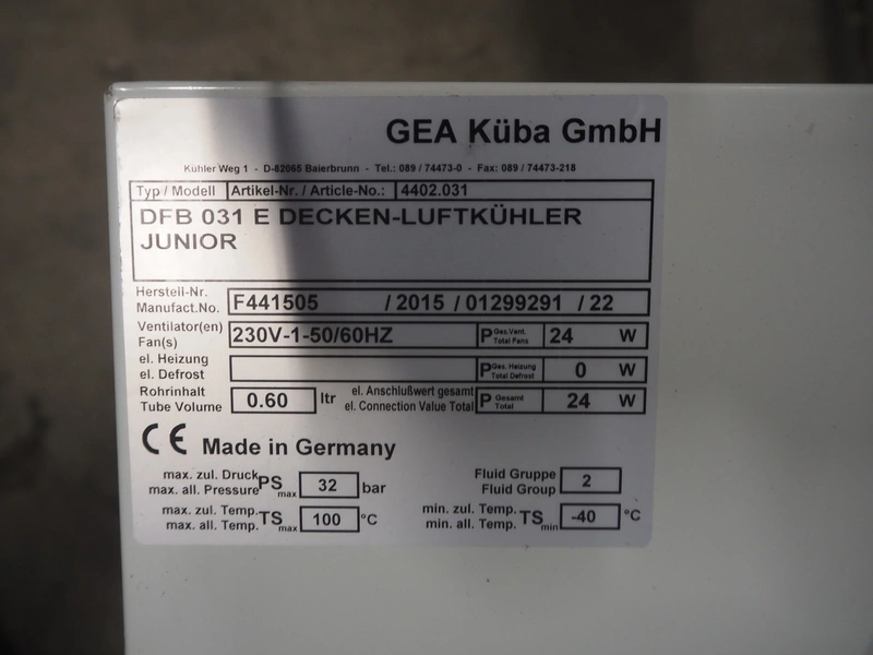 Gea Küba GmbH evaporator, model: DFB 031 E DECKEN-LUFTKÜHLER JUNIOR, number: F441505, year of construction: 2015, 230 V, 50/60 Hz, 24 W, dimensions: 530 mm x 510 mm x 230 mm.