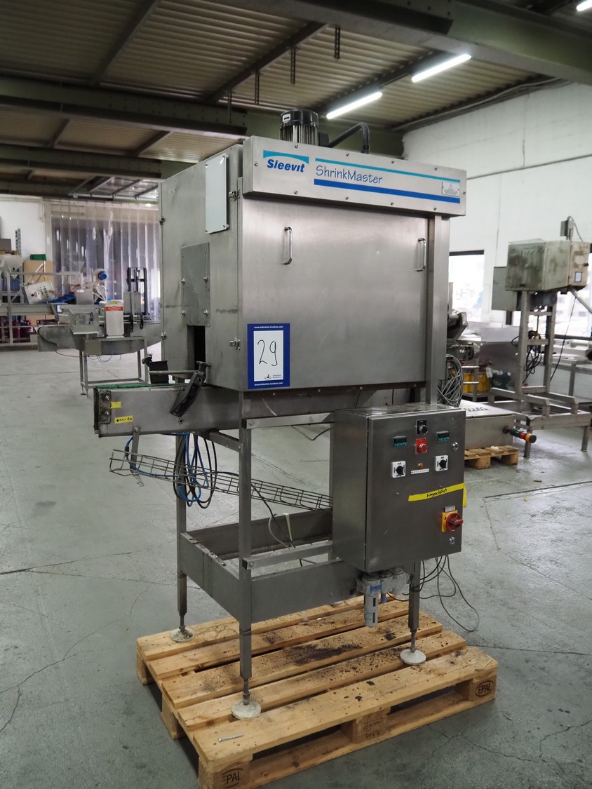 Sleevit dry tunnel, model: Shrinkmaster, belt width: 85 mm, total dimensions: 1250 mm x 950 mm x 2000 mm.