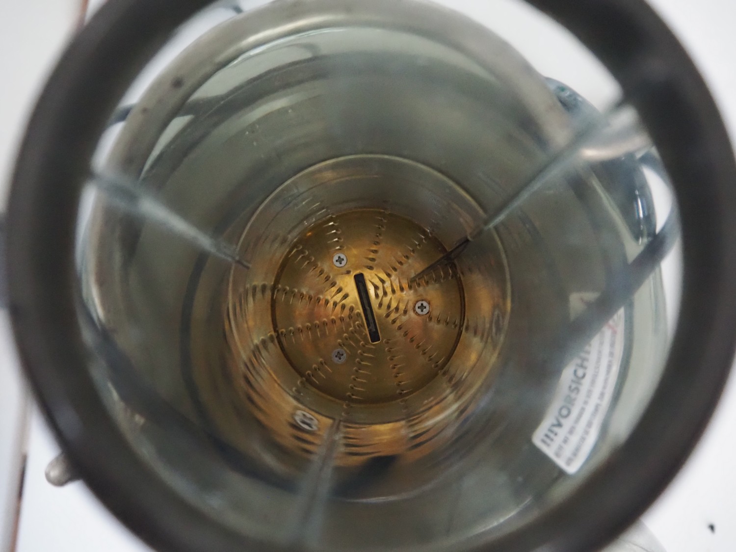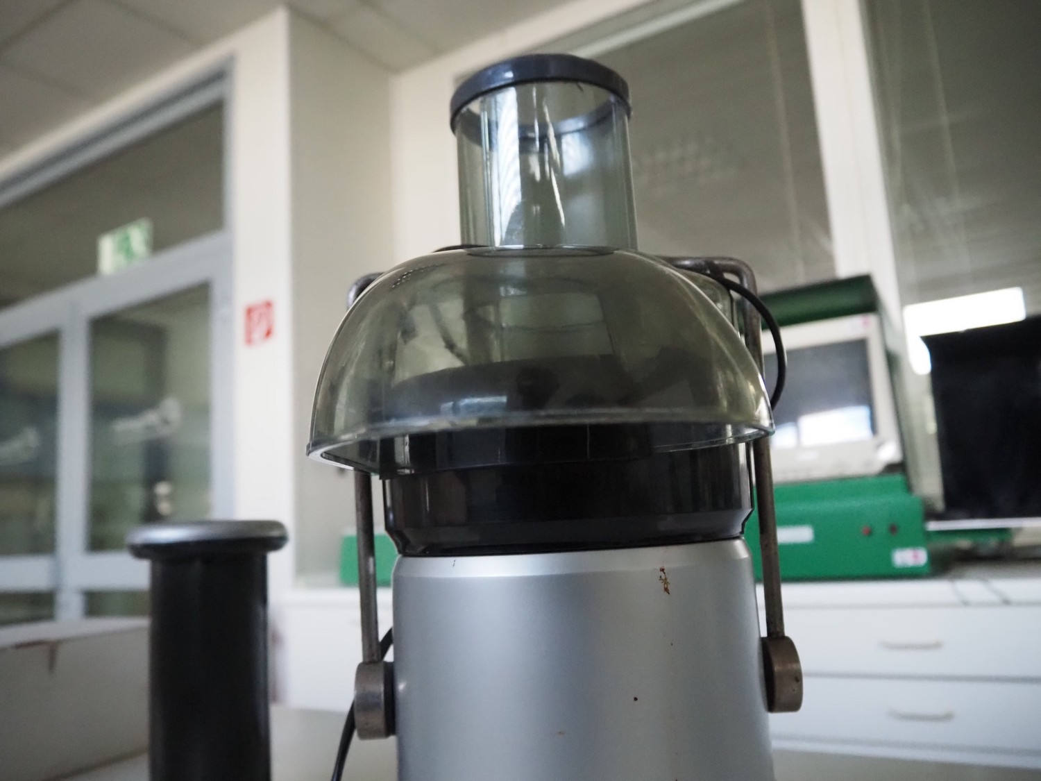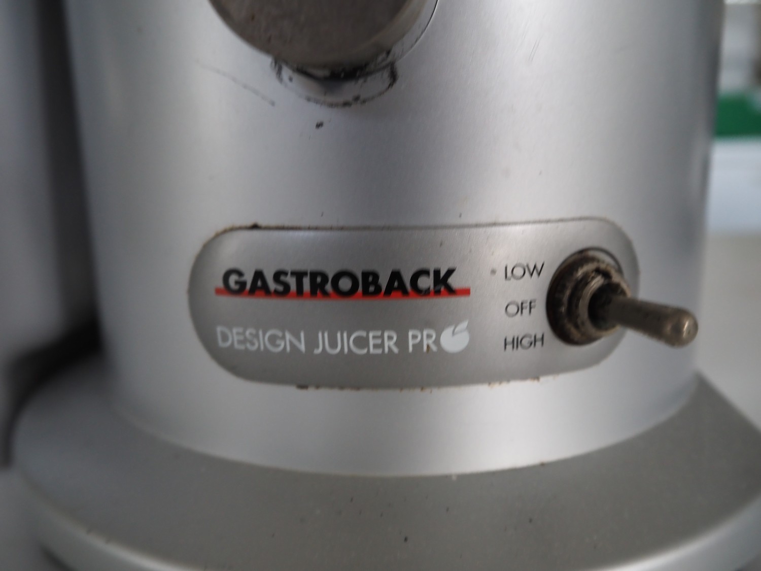 Gastroback juicer, dimensions pulp bin: 140 mm x 110 mm x 200 mm, total dimensions: 350 mm x 200 mm x 450 mm.
