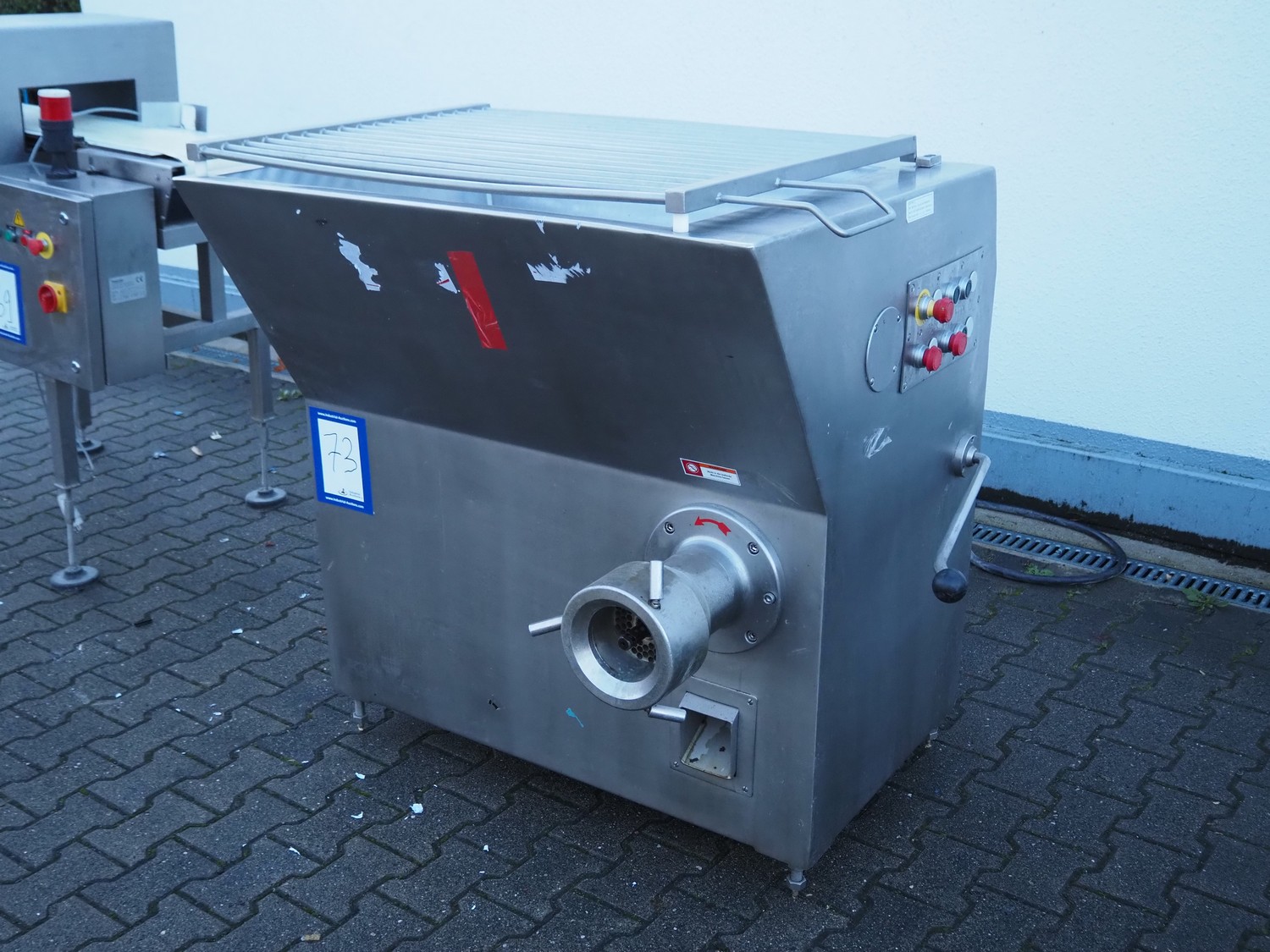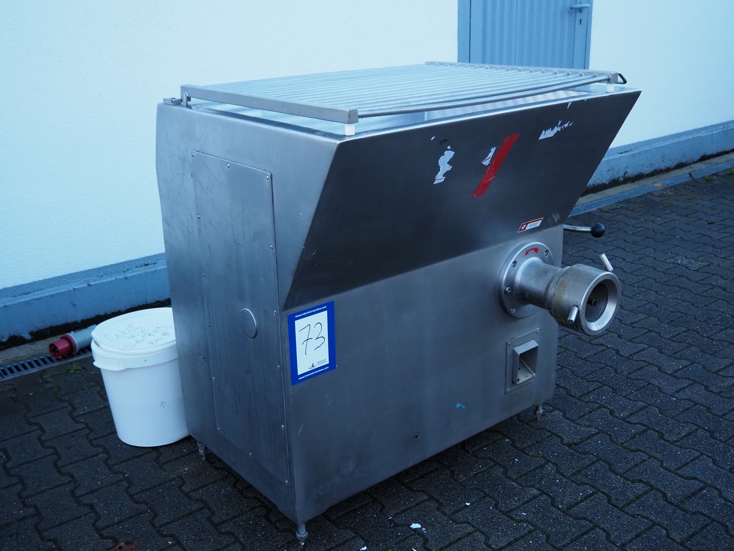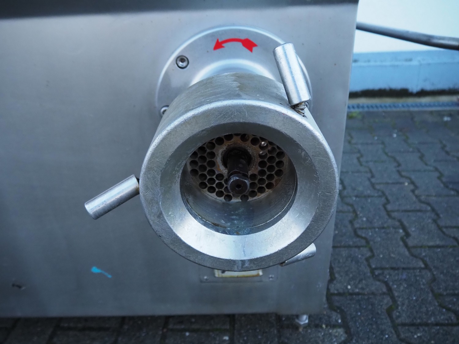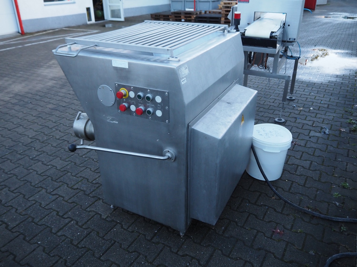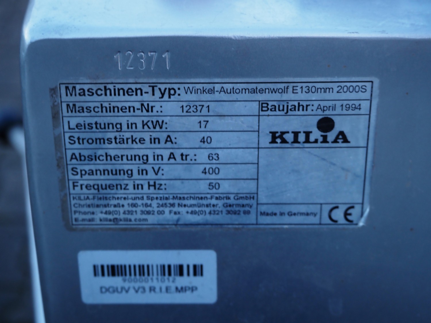 Kilia grinder, type: Winkel-Automatenwolf E130mm 2000s, machine number: 12371, year of construction: April 1994, 400 V, 3 Ph, 50 Hz, 40 A. 17 kW, plate diameter: 130 mm, total dimensions: 1200 mm x 1200 mm x 1300 mm. Missing mixing arm. Including bucket with additional plates.