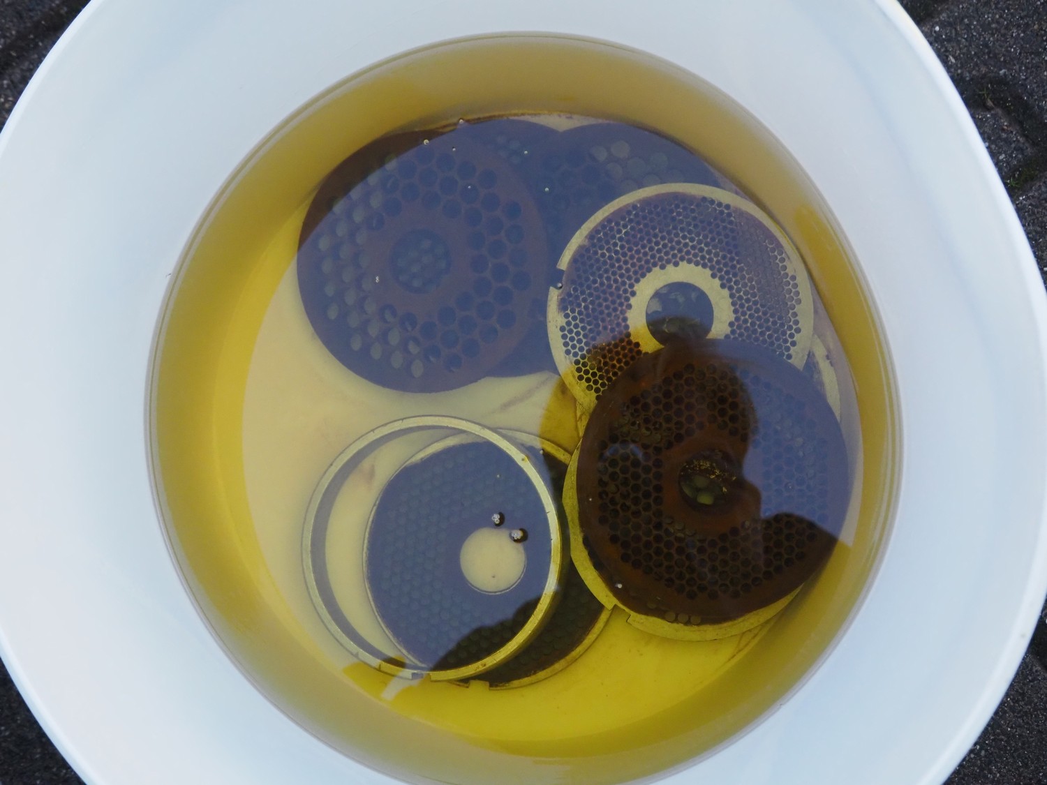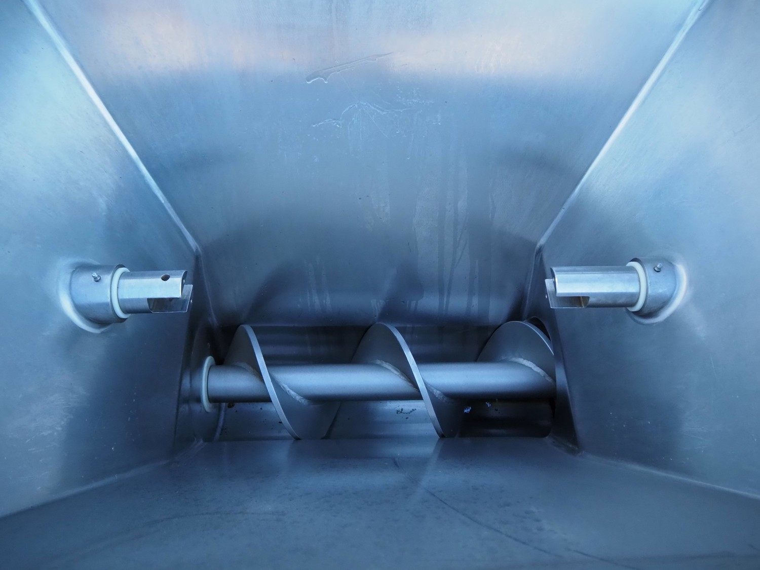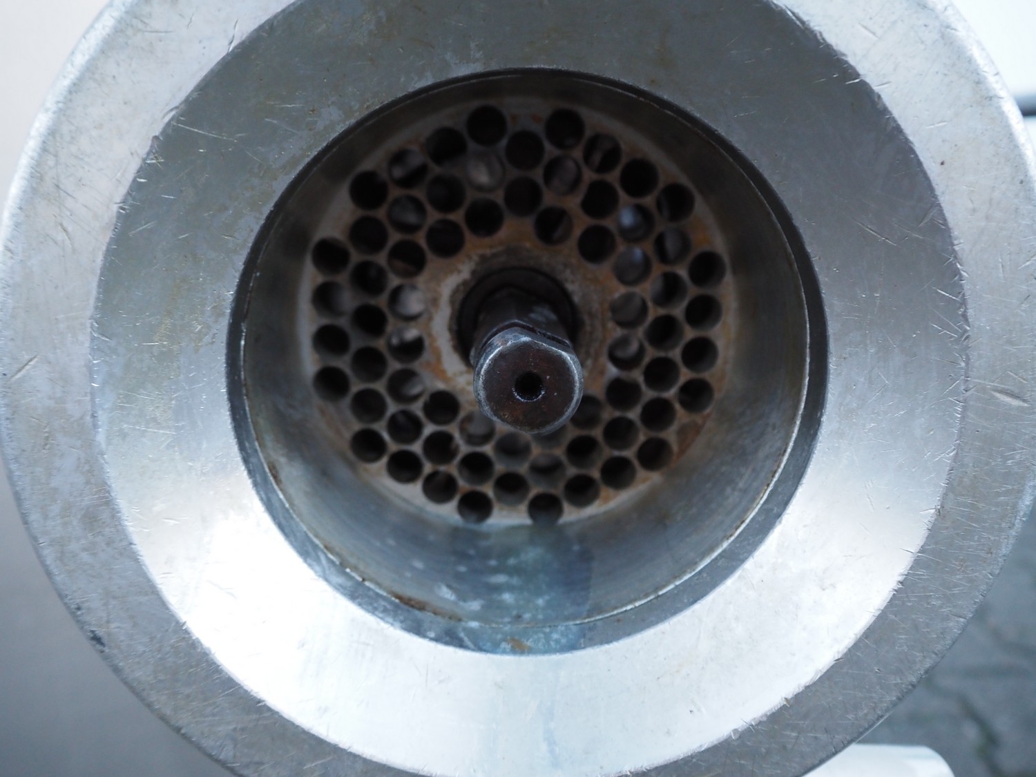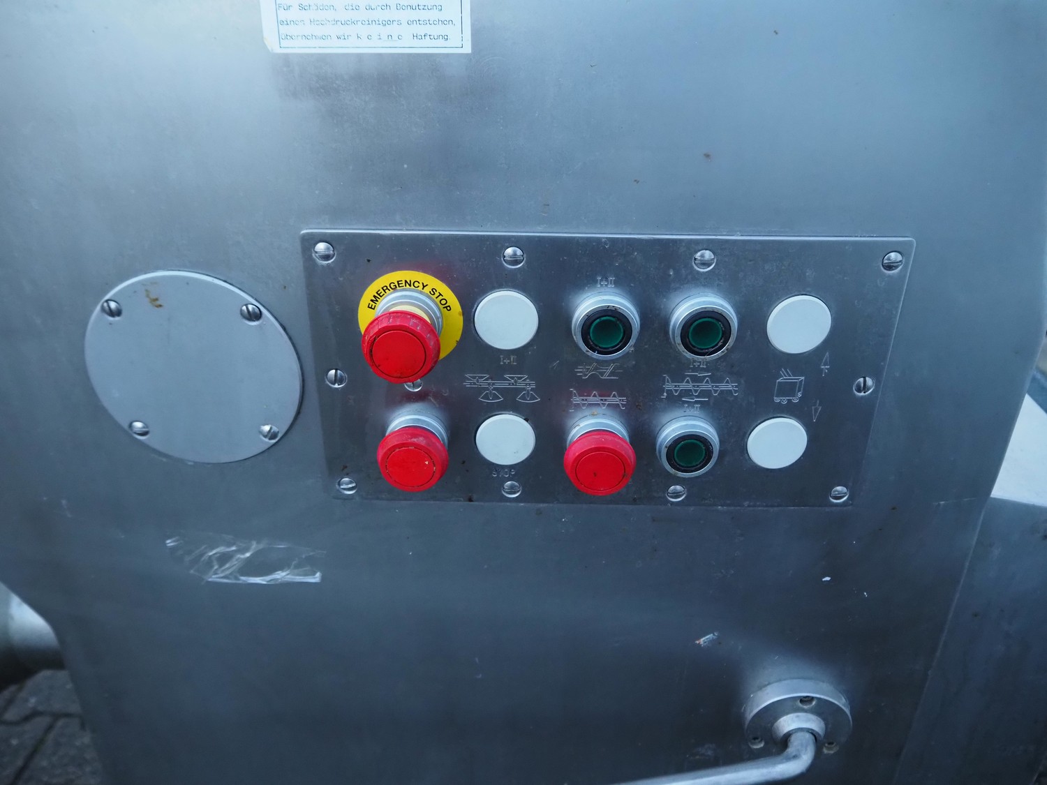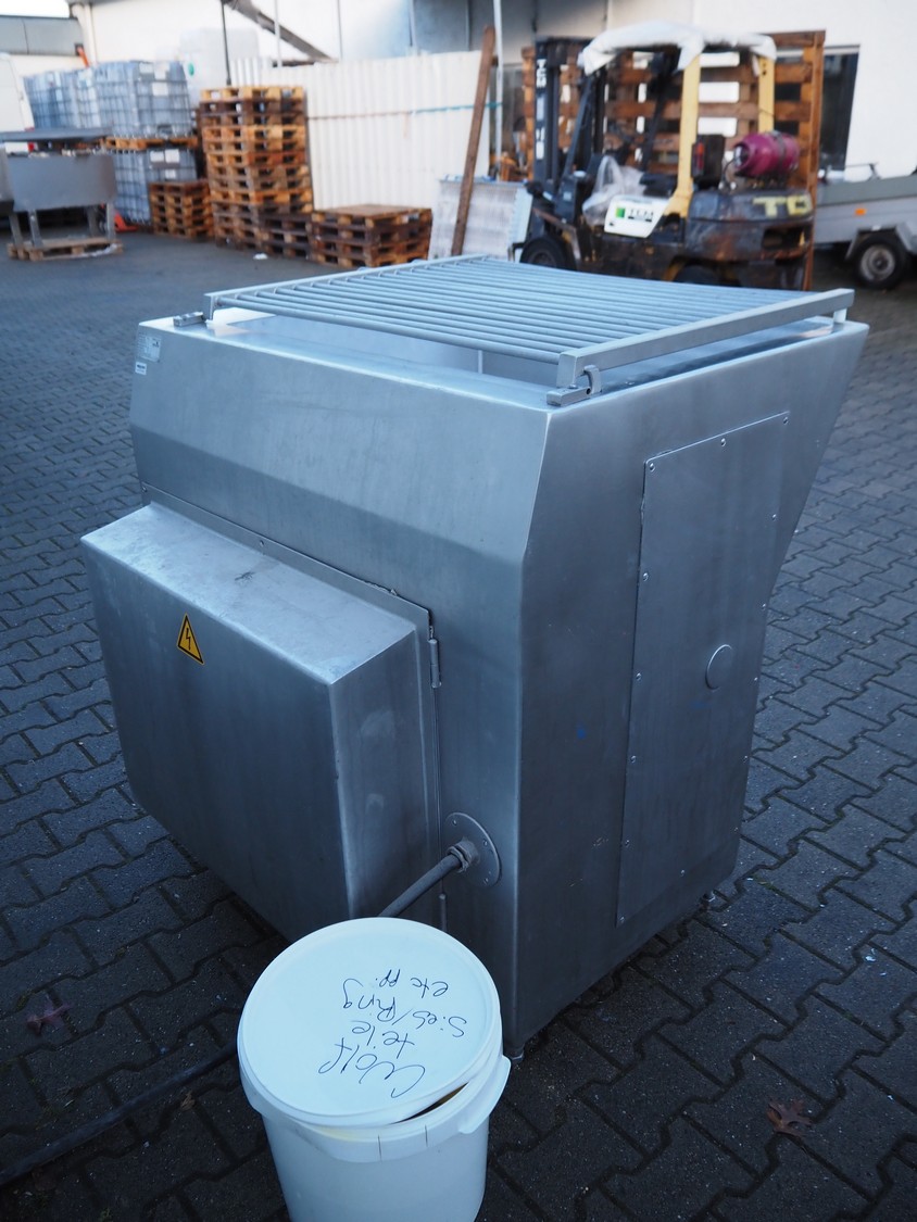 Kilia grinder, type: Winkel-Automatenwolf E130mm 2000s, machine number: 12371, year of construction: April 1994, 400 V, 3 Ph, 50 Hz, 40 A. 17 kW, plate diameter: 130 mm, total dimensions: 1200 mm x 1200 mm x 1300 mm. Missing mixing arm. Including bucket with additional plates.