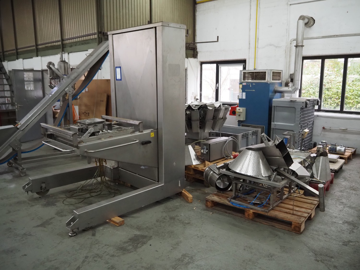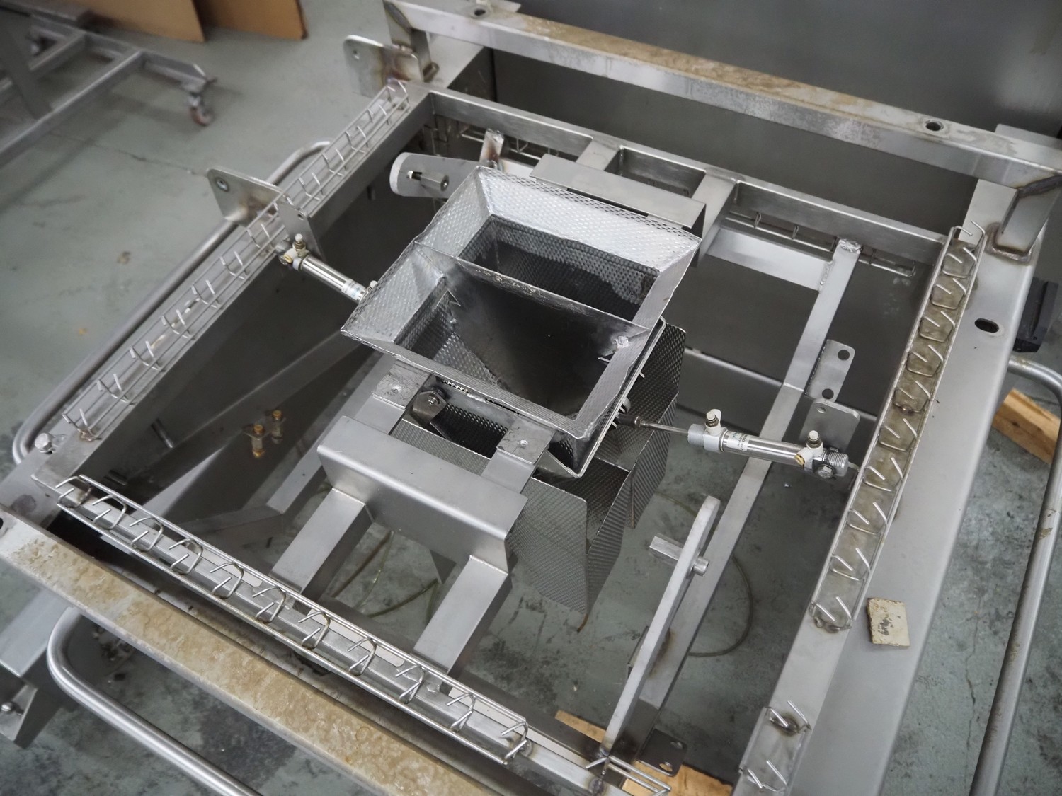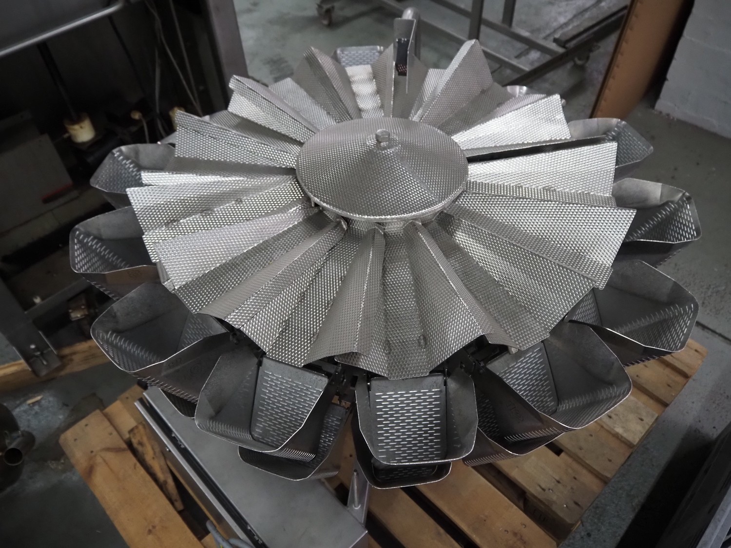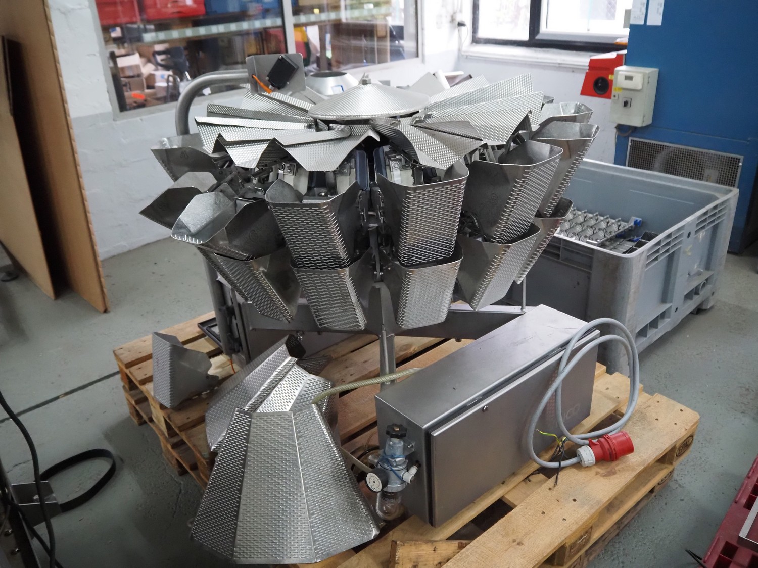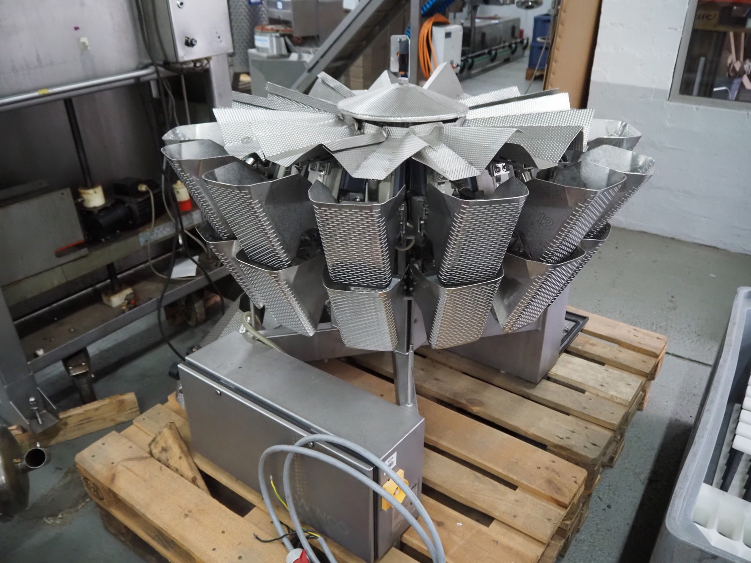 Bilwinco 14-heads multihead weigher, type: DW60/14-D, number: 5048, year of construction: 2000, 400 V, 3 Ph, 50 Hz, 10 A, 5000 VA, weighing range: 50 gram - 1000 gram, pressure: 5-10 bar, dimensions: 1100 mm x 900 mm x 1000 mm, Bilwinco A/S frame for multihead weigher, dimensions frame: 1800 mm x 1400 mm x 2300 mm, with spare 14-heads multihead weigher, dimensions multihead weigher: 800 mm x 800 mm 750 mm. Missing buckets.