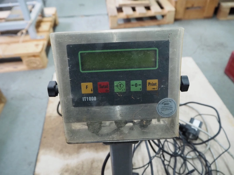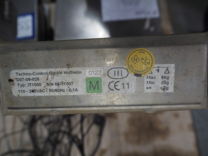Techno-control GmbH weighing scale, type: IT1000, serial number: 06-11007, 110/240 Vac, 50/60 Hz, 0.1 A, min/max weight: 40 g/6 kg, e = 2g, scale dimensions: 400 mm x 330 mm, total dimensions: 550 mm x 400 mm x 540 mm.