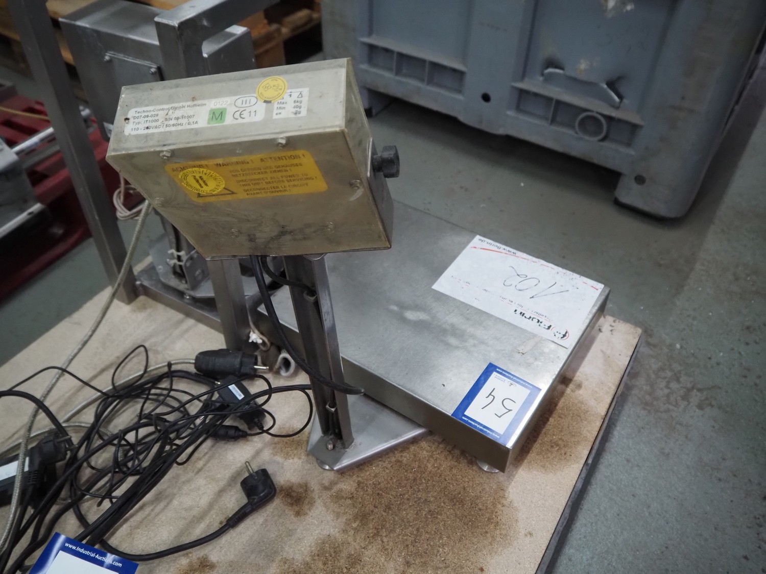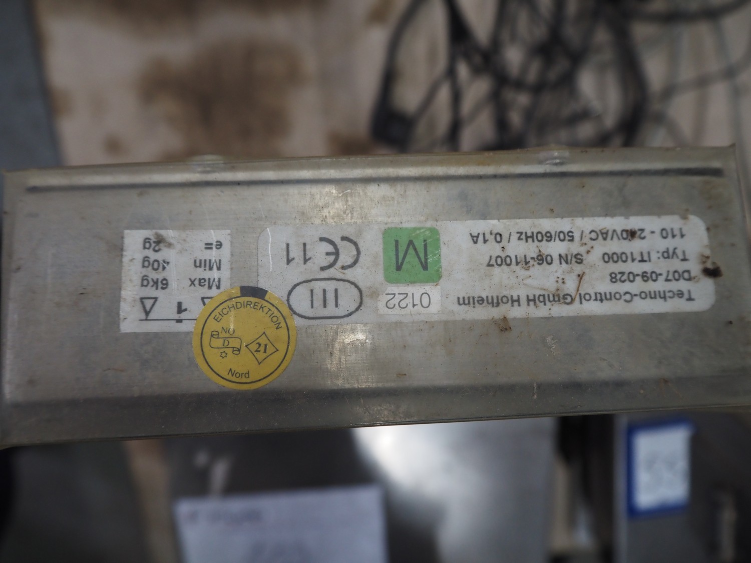 Techno-control GmbH weighing scale, type: IT1000, serial number: 06-11007, 110/240 Vac, 50/60 Hz, 0.1 A, min/max weight: 40 g/6 kg, e = 2g, scale dimensions: 400 mm x 330 mm, total dimensions: 550 mm x 400 mm x 540 mm.