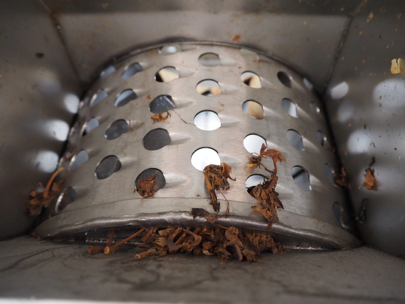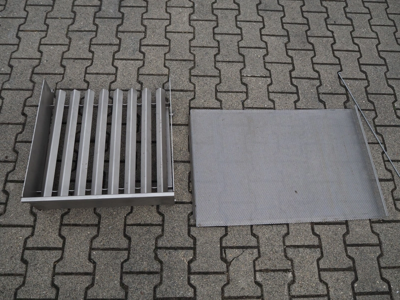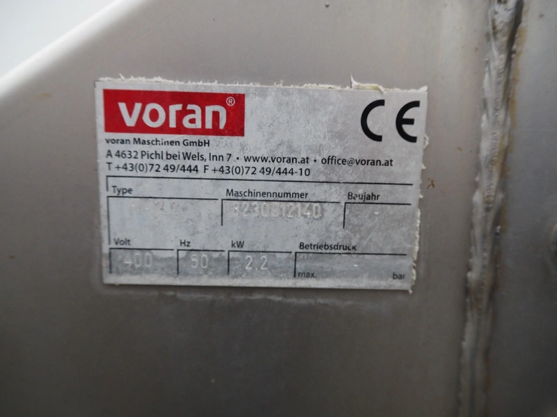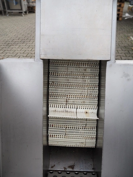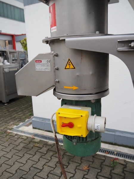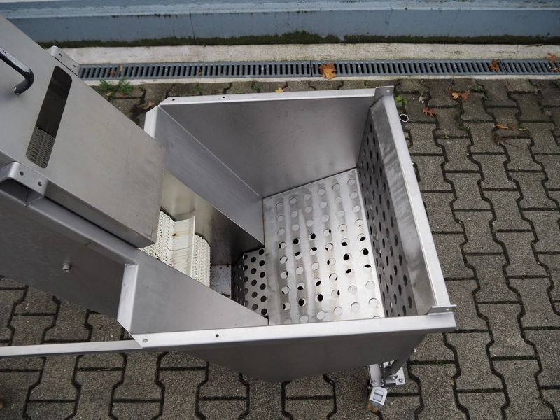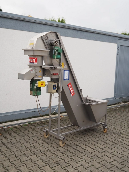 Voran mobile elevating belt with centrifugal mill used for fruits, type elevating belt: SA, machine number: 1465101150, 230 V, 50 Hz, 0.37 kW, type centrifugal mill: RM2.2, machine number: 3230912140, 400 V, 50 Hz, 2.2 kW, plastic mesh belt with dividers, belt width: 240 mm, divider height: 70 mm, distance between dividers: 400 mm, elevating height: 1750 mm, diameter perforations: 20 mm, total dimensions: 2100 mm x 670 mm x 2100 mm.