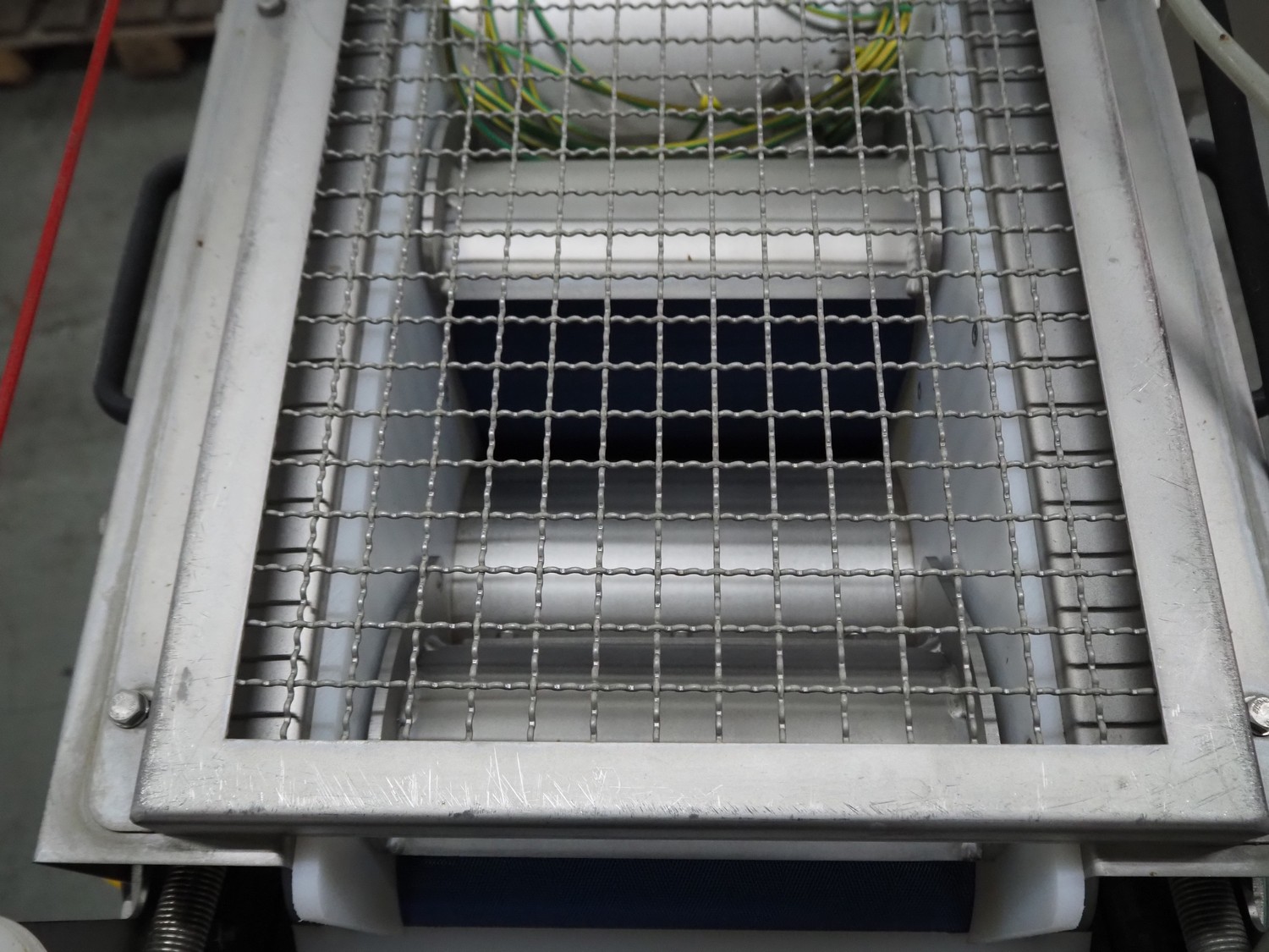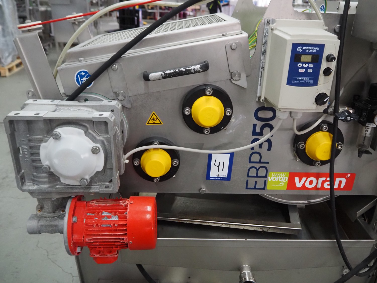 Voran belt press, type: EBP350, serial number: M0003405F/04/00003, 400 V, 50 Hz, 0.49 kW, plastic belt, belt width: 360 mm, s/s rollers, roller width: 360 mm, total dimensions: 1300 mm x 750 mm x 1450 mm.