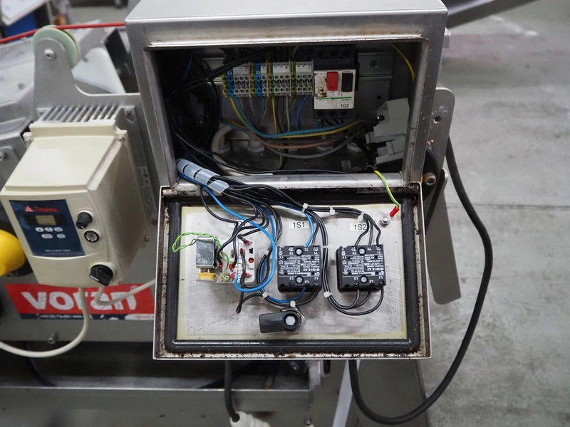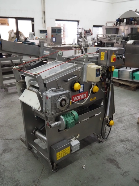 Voran belt press, type: EBP350, machine number: 1640101214, 400 V, 50 Hz, 0.49 kW, s/s rollers, roller width: 360 mm, total dimensions: 1300 mm x 750 mm x 1450 mm. Missing belt.