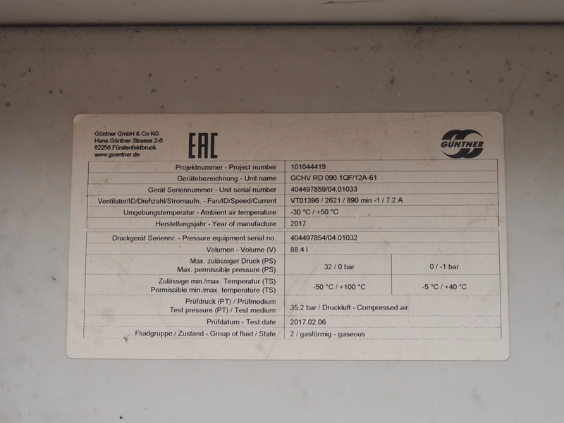 Güntner GmbH & Co KG condenser, 2 fans, unit name: GCHV RD 090.1QF/12A-61, unit serial number: 404497859/04.01033, year of construction: 2017, TS: -50/+100 °C, PS: 32/0 bar, PT: 35.2 bar, volume: 88.4 liter, dimensions: 3050 mm x 2200 mm x 1550 mm.
