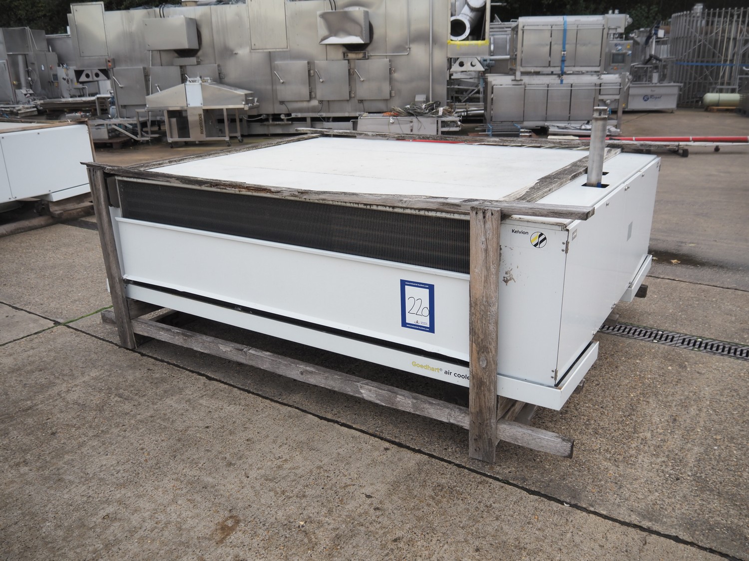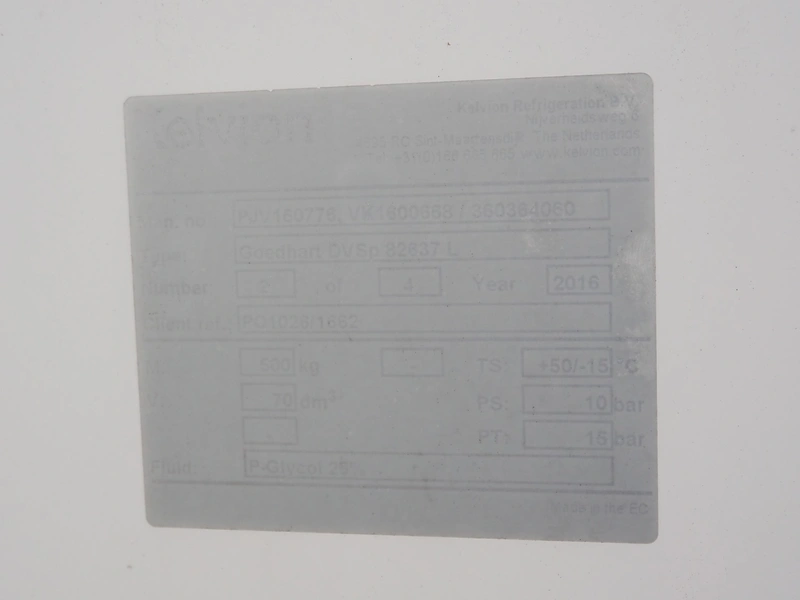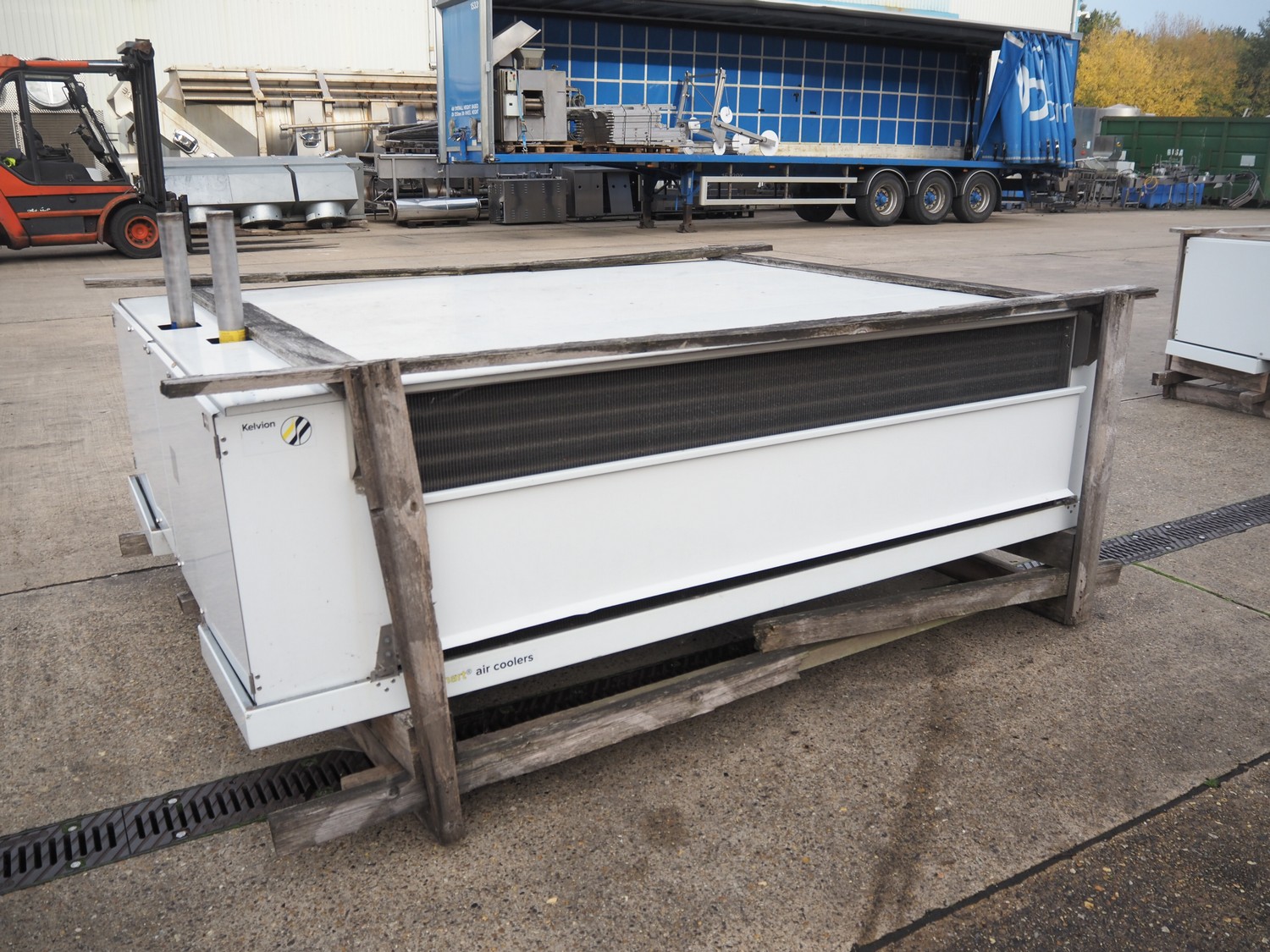 Kelvion Refrigeration B.V. evaporator, type: Goedhart DVSp 82637L, serial number: PJV160776. VK1600668/360364060, year of construction: 2016, TS: +50/-15 °C, PS: 10 bar, PT: 15 bar, volume: 70 dm³, weight: 500 kg, 2 fans, dimensions: 2500 mm x 1850 mm x 1250 mm.